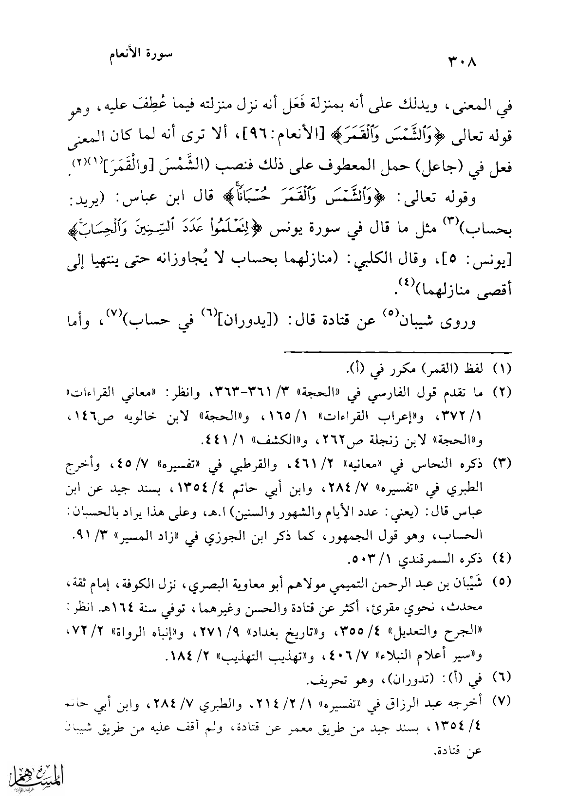 وروى شيبان (¬5) عن قتادة قال: ([يدوران] (¬6) في حساب) (¬7)، وأما