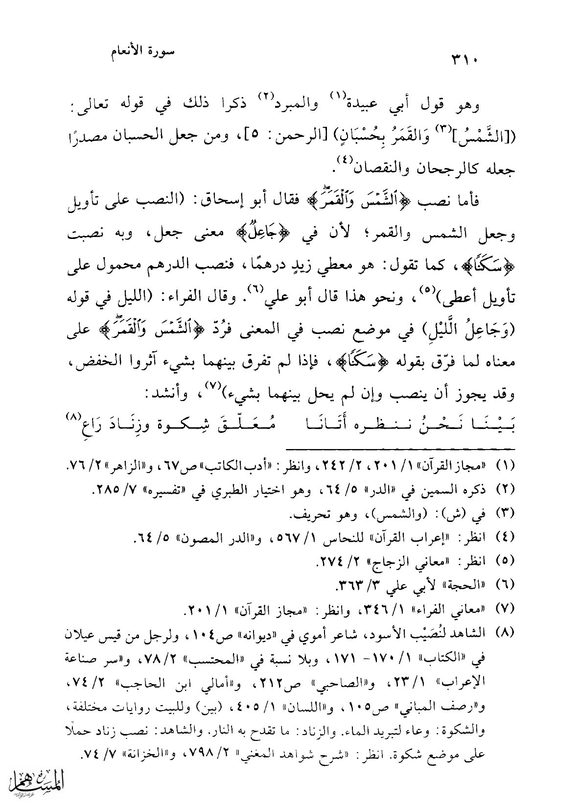 فأما نصب {الشَّمْسَ وَالْقَمَرَ} فقال أبو إسحاق: (النصب على تأويل وجعل الشمس والقمر؛ لأن في {جَاعِلٌ} معنى جعل، وبه نصبت {سَكَنًا}، كما تقول: هو معطي زيدٍ درهمًا، فنصب الدرهم محمول على تأويل أعطى) (¬5)، ونحو هذا قال أبو علي (¬6). وقال الفراء: (الليل في قوله (وَجَاعِلُ الَّليْلِ) في موضع نصب في المعنى فرُد {الشَّمْسَ وَالْقَمَرَ} على معناه لما فرّق بقوله {سَكَنًا}، فإذا لم تفرق بينهما بشيء آثروا الخفض، وقد يجوز أن ينصب وإن لم يحل بينهما بشيء) (¬7)، وأنشد:
