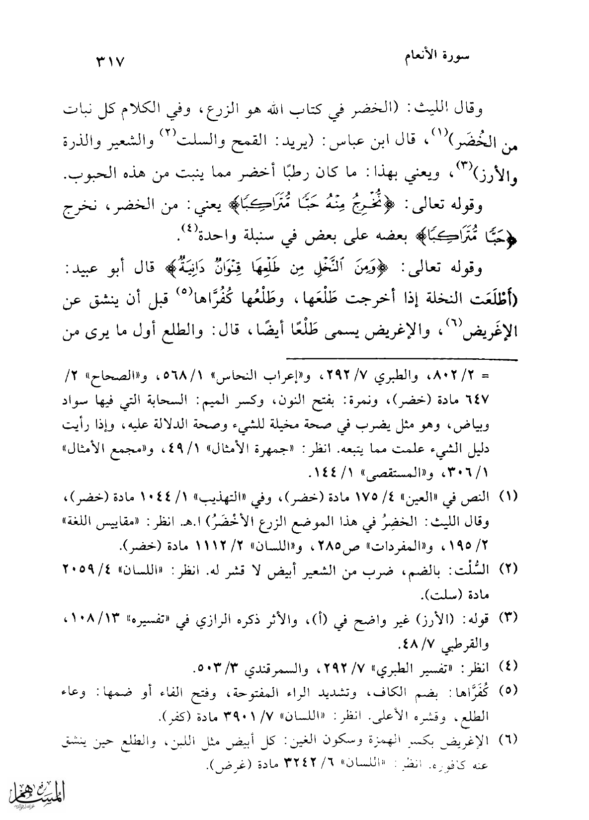 وقال الليث: (الخضر في كتاب الله هو الزرع، وفي الكلام كل نبات من الخُضَر) (¬1)، قال ابن عباس: (يريد: القمح والسلت (¬2) والشعير والذرة والأرز) (¬3)، ويعني بهذا: ما كان رطبًا أخضر مما ينبت من هذه الحبوب.