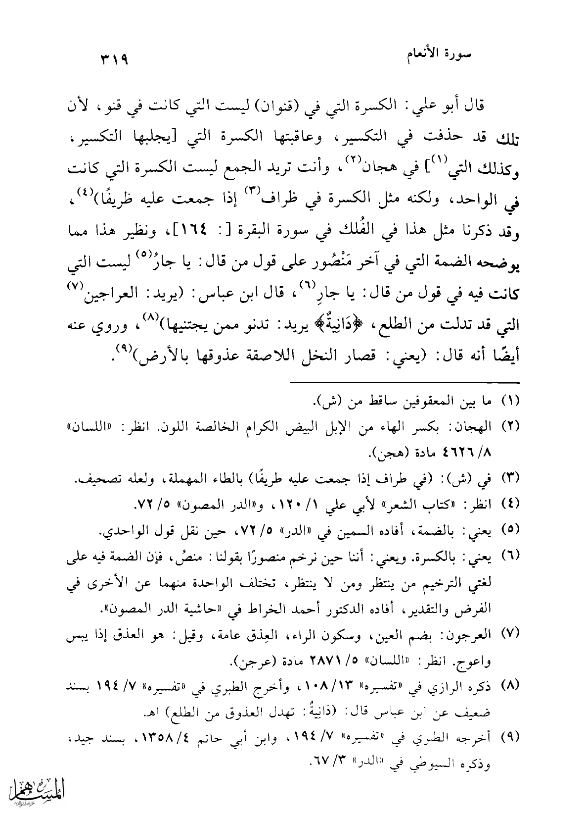 (¬6) يعني: بالكسرة. ويعني: أننا حين نرخم منصورًا بقولنا: منصُ، فإن الضمة فيه على لغتي الترخيم من ينتظر ومن لا ينتظر، تختلف الواحدة منهما عن الأخرى في الفرض والتقدير، أفاده الدكتور أحمد الخراط في "حاشية الدر المصون".