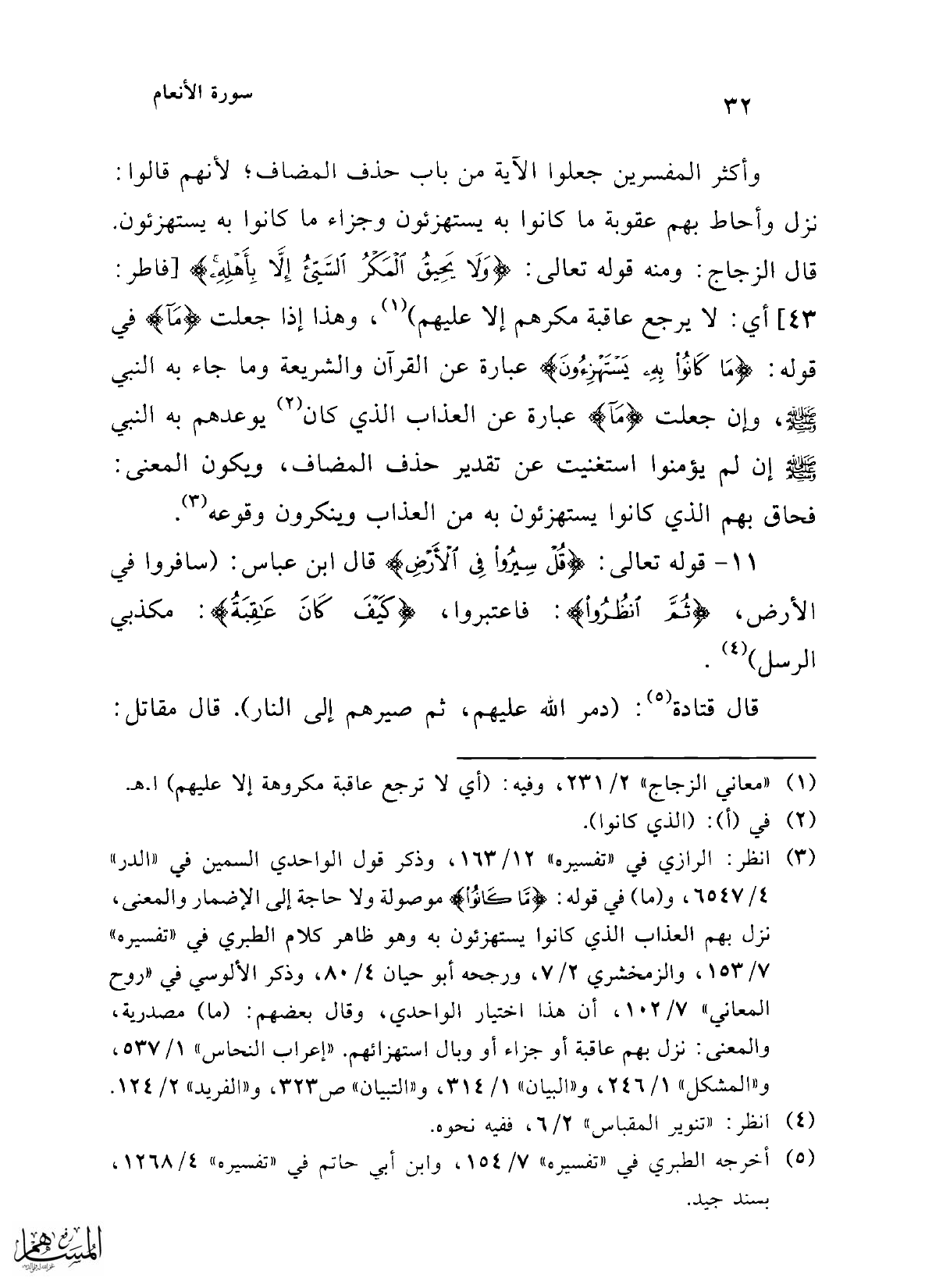 وأكثر المفسرين جعلوا الآية من باب حذف المضاف؛ لأنهم قالوا: نزل وأحاط بهم عقوبة ما كانوا به يستهزئون وجزاء ما كانوا به يستهزئون. قال الزجاج: ومنه قوله تعالى: {وَلَا يَحِيقُ الْمَكْرُ السَّيِّئُ إِلَّا بِأَهْلِهِ} [فاطر: 43] أي: لا يرجع عاقبة مكرهم إلا عليهم) (¬1)، وهذا إذا جعلت {مَا} في قوله: {مَا كَانُوا بِهِ يَسْتَهْزِئُونَ} عبارة عن القرآن والشريعة وما جاء به النبي - صلى الله عليه وسلم -، وإن جعلت {مَا} عبارة عن العذاب الذي كان (¬2) يوعدهم به النبي - صلى الله عليه وسلم - إن لم يؤمنوا استغنيت عن تقدير حذف المضاف، ويكون المعنى: فحاق بهم الذي كانوا يستهزئون به من العذاب وينكرون وقوعه (¬3).