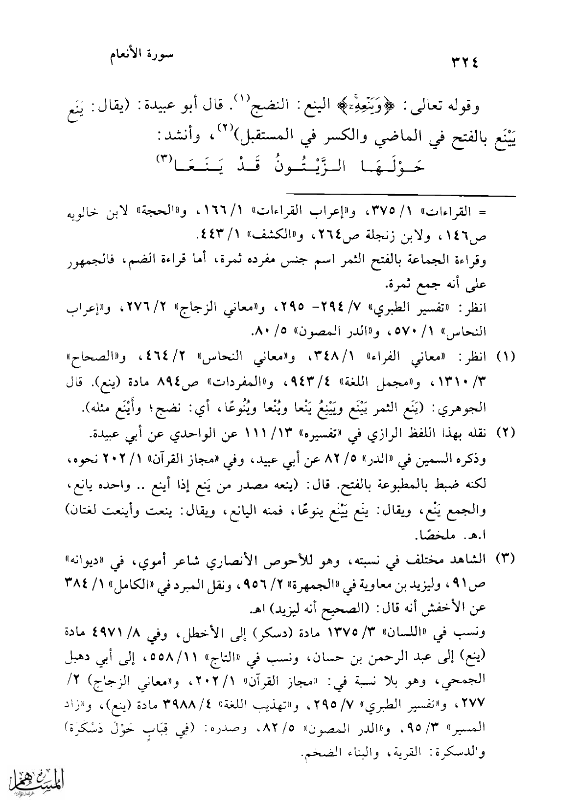 (¬2) نقله بهذا اللفظ الرازي في "تفسيره" 13/ 111 عن الواحدي عن أبي عبيدة. وذكره السمين في "الدر" 5/ 82 عن أبي عبيد، وفي "مجاز القرآن" 1/ 202 نحوه، لكنه ضبط بالمطبوعة بالفتح. قال: (ينعه مصدر من يَنع إذا أينع .. واحده يانع، والجمع يَنْع، ويقال: ينَع يَيْنَع ينوعًا، فمنه اليانع، ويقال: ينعت وأينعت لغتان) ا. هـ. ملخصًا.
