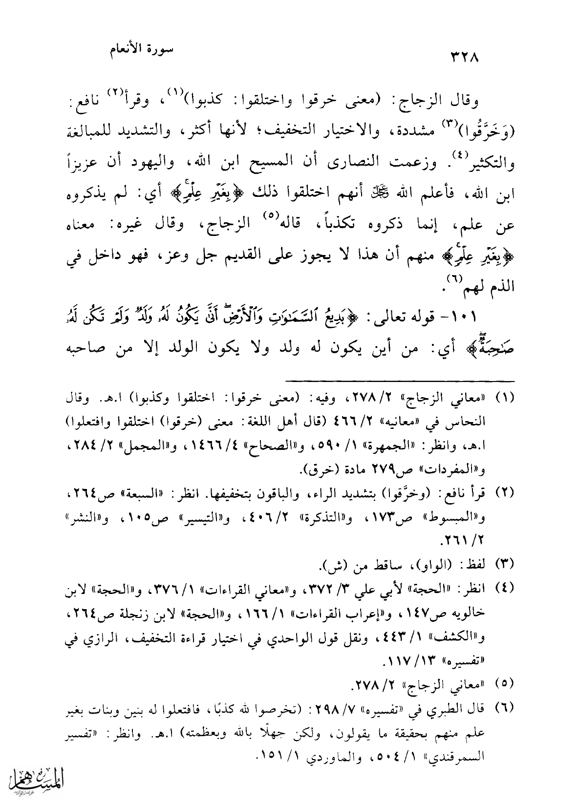 (¬6) قال الطبري في "تفسيره" 7/ 298: (تخرصوا لله كذبًا، فافتعلوا له بنين وبنات بغير علم منهم بحقيقة ما يقولون، ولكن جهلاً بالله وبعظمته) ا. هـ. وانظر: "تفسير السمرقندي" 1/ 504، والماوردي 1/ 151.