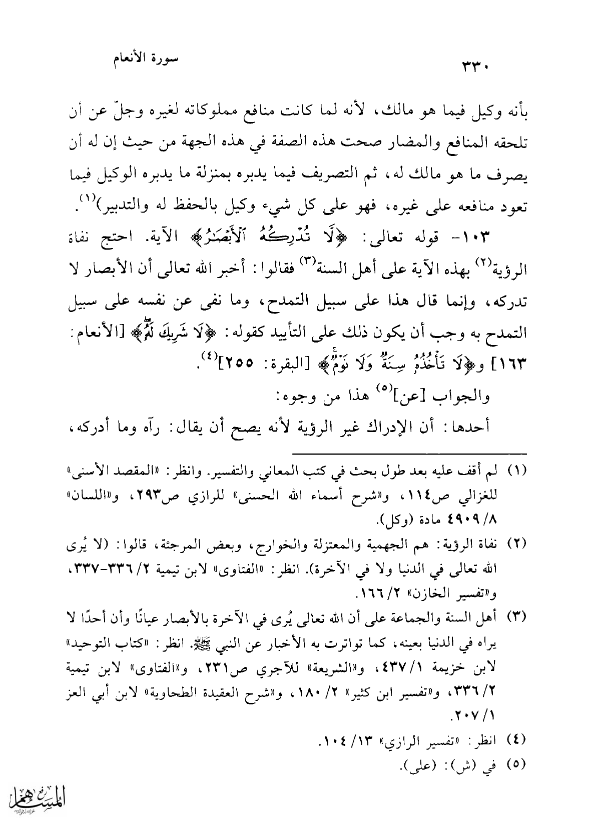 103 - قوله تعالى: {لَا تُدْرِكُهُ الْأَبْصَارُ} الآية. احتج نفاة الرؤية (¬2) بهذه الآية على أهل السنة (¬3) فقالوا: أخبر الله تعالى أن الأبصار لا تدركه، وإنما قال هذا على سبيل التمدح، وما نفى عن نفسه على سبيل التمدح به وجب أن يكون ذلك على التأييد كقوله: {لَا شَرِيكَ لَهُ} [الأنعام: 163]، و {لَا تَأْخُذُهُ سِنَةٌ وَلَا نَوْمٌ} [البقرة: 255] (¬4).