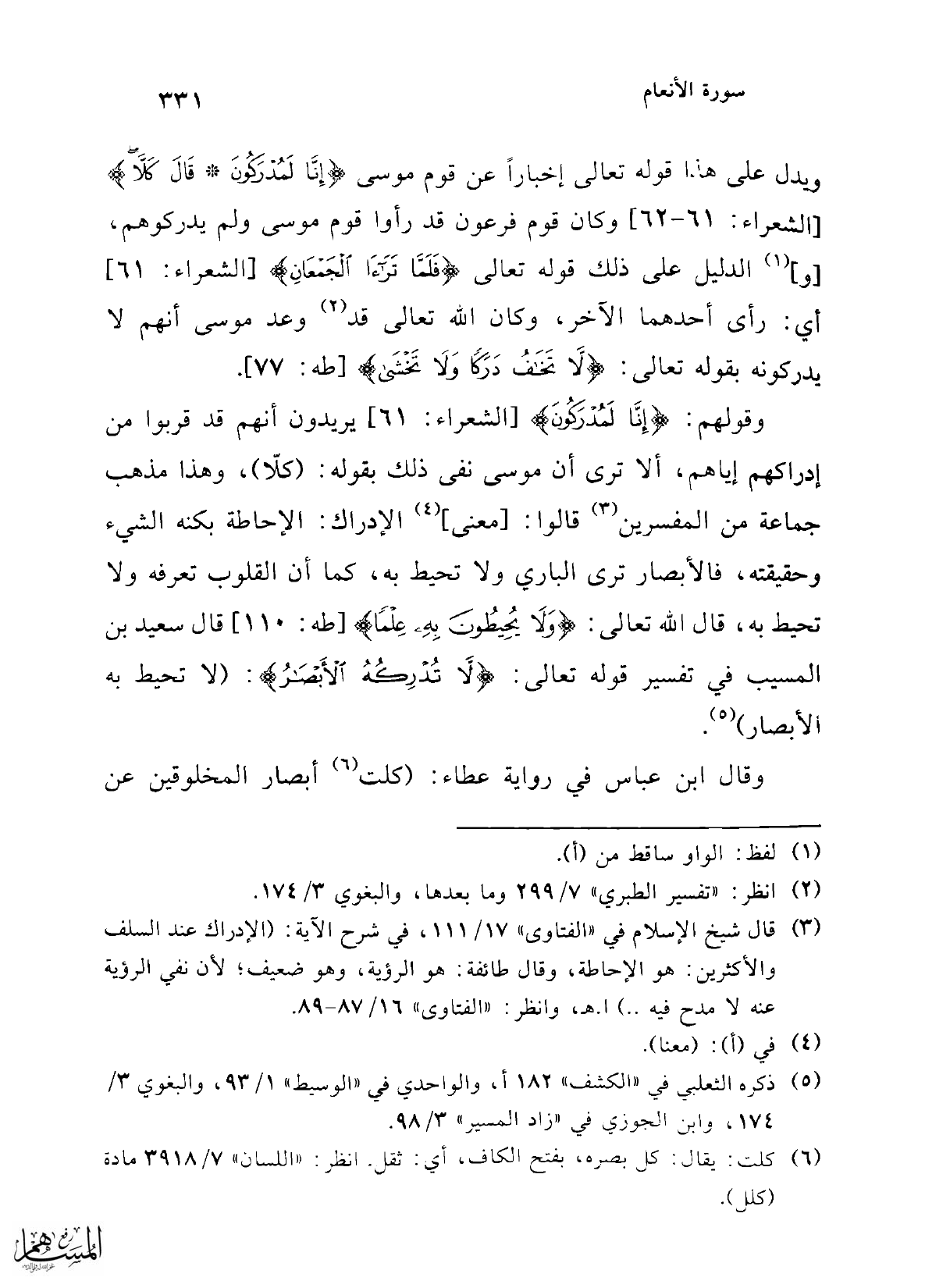 (¬3) قال شيخ الإسلام في "الفتاوى" 17/ 111، في شرح الآية: (الإدراك عند السلف والأكثرين: هو الإحاطة، وقال طائفة: هو الرؤية، وهو ضعيف؛ لأن نفي الرؤية عنه لا مدح فيه ..) ا. هـ، وانظر: "الفتاوى" 16/ 87 - 89.
