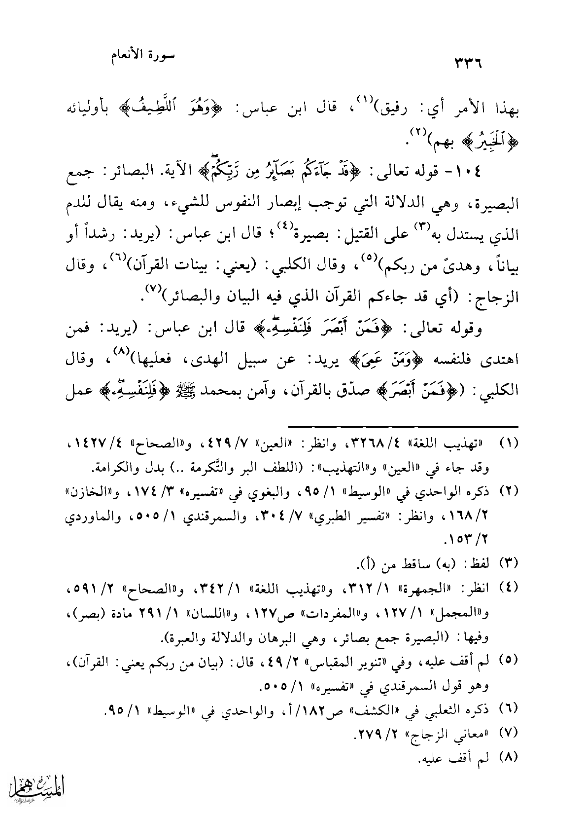 104 - قوله تعالى: {قَدْ جَاءَكُمْ بَصَائِرُ مِنْ رَبِّكُمْ} الآية. البصائر: جمع البصيرة، وهي الدلالة التي توجب إبصار النفوس للشيء، ومنه يقال للدم الذي يستدل به (¬3) على القتيل: بصيرة (¬4)؛ قال ابن عباس: (يريد: رشداً أو بياناً، وهدىً من ربكم) (¬5)، وقال الكلبي: (يعني: بينات القرآن) (¬6)، وقال الزجاج: (أي قد جاءكم القرآن الذي فيه البيان والبصائر) (¬7).