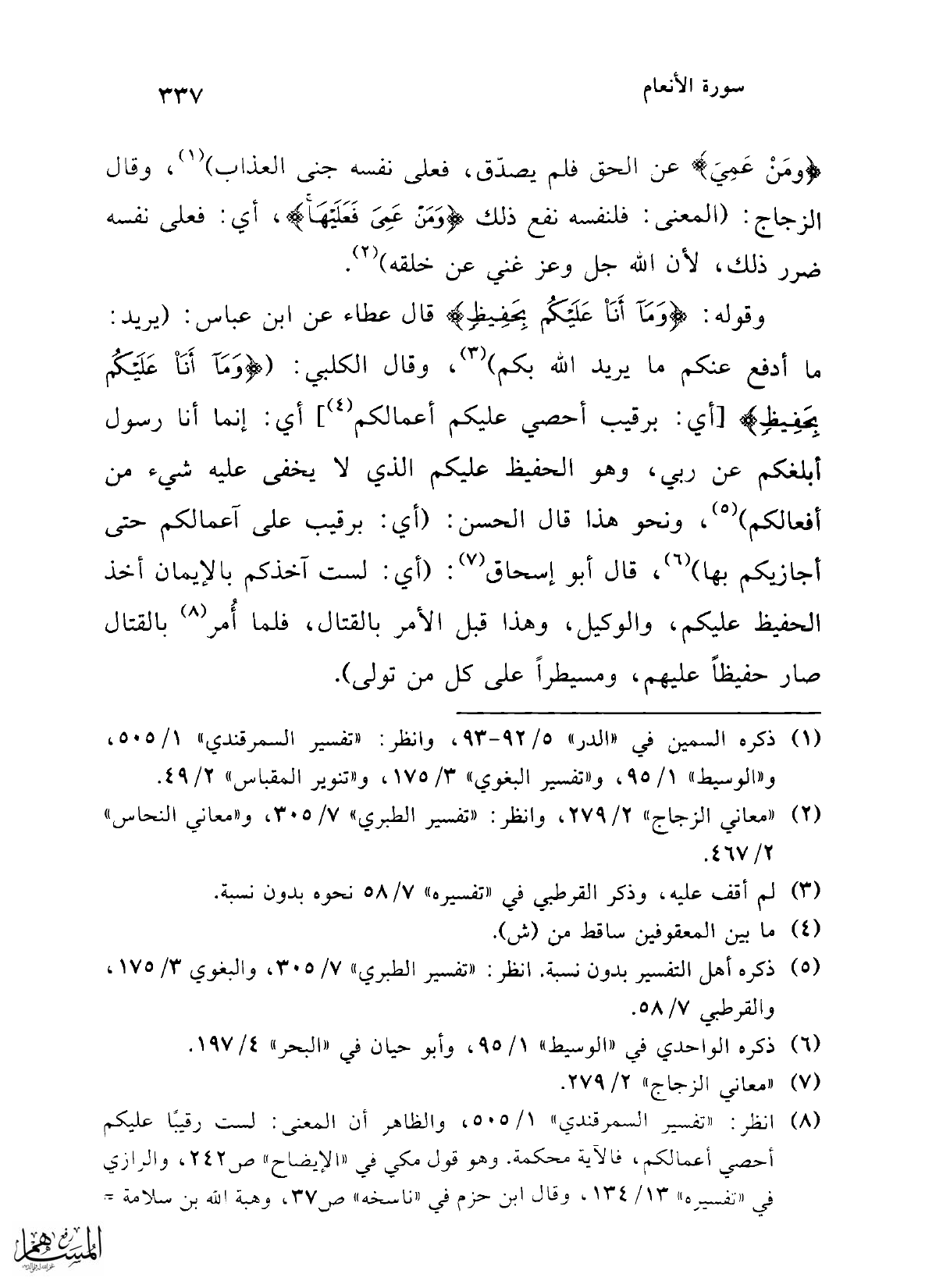 (¬8) انظر: "تفسير السمرقندي" 1/ 505، والظاهر أن المعنى: لست رقيبًا عليكم أحصي أعمالكم، فالآية محكمة. وهو قول مكي في "الإيضاح" ص 242، والرازي في "تفسيره" 13/ 134 , وقال ابن حزم في "ناسخه" ص 37، وهبة الله بن سلامة =