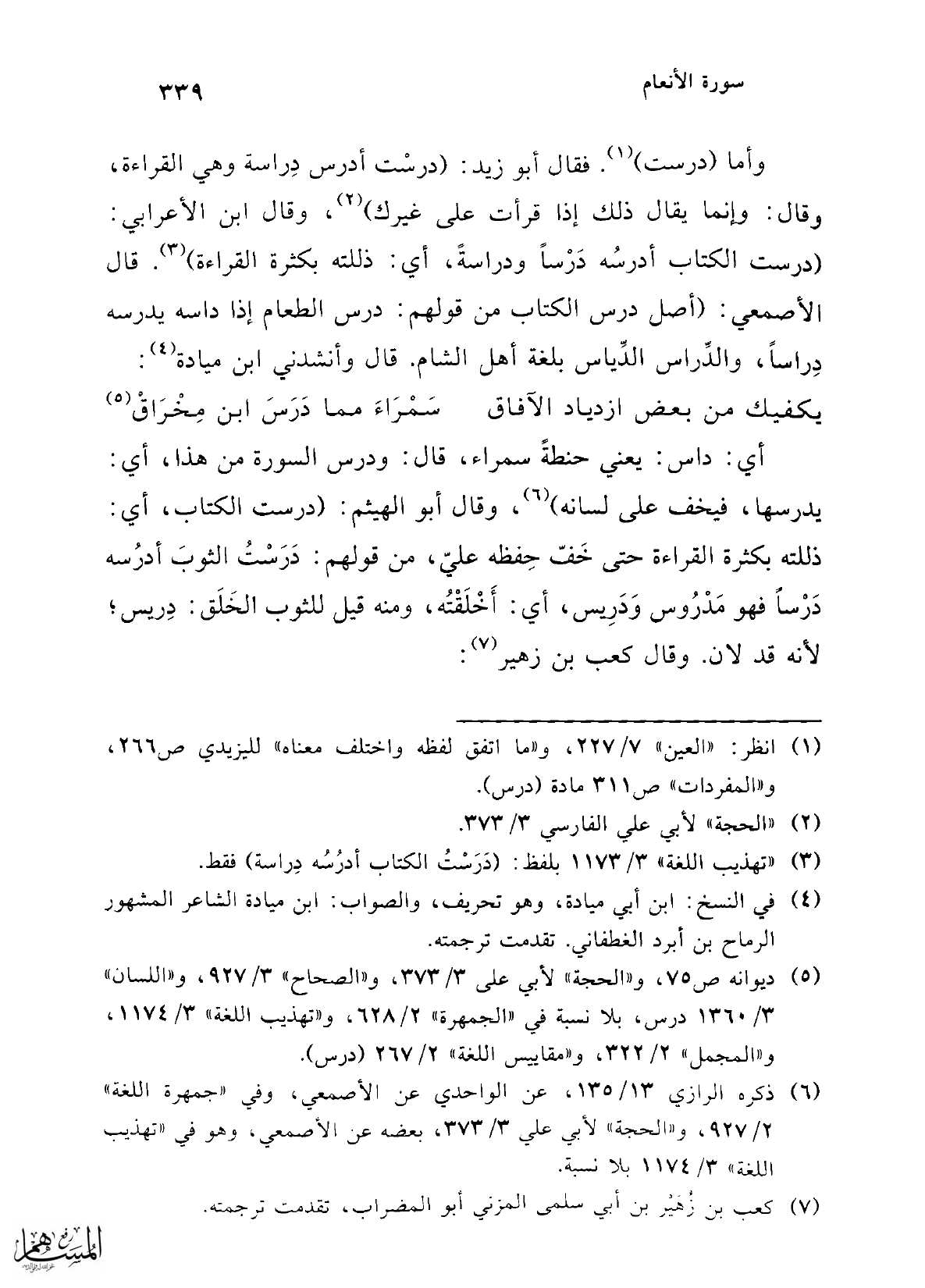 (¬3) "تهذيب اللغة" 3/ 1173 بلفظ: (دَرَسْتُ الكتاب أدرُسُه دراسة) فقط.