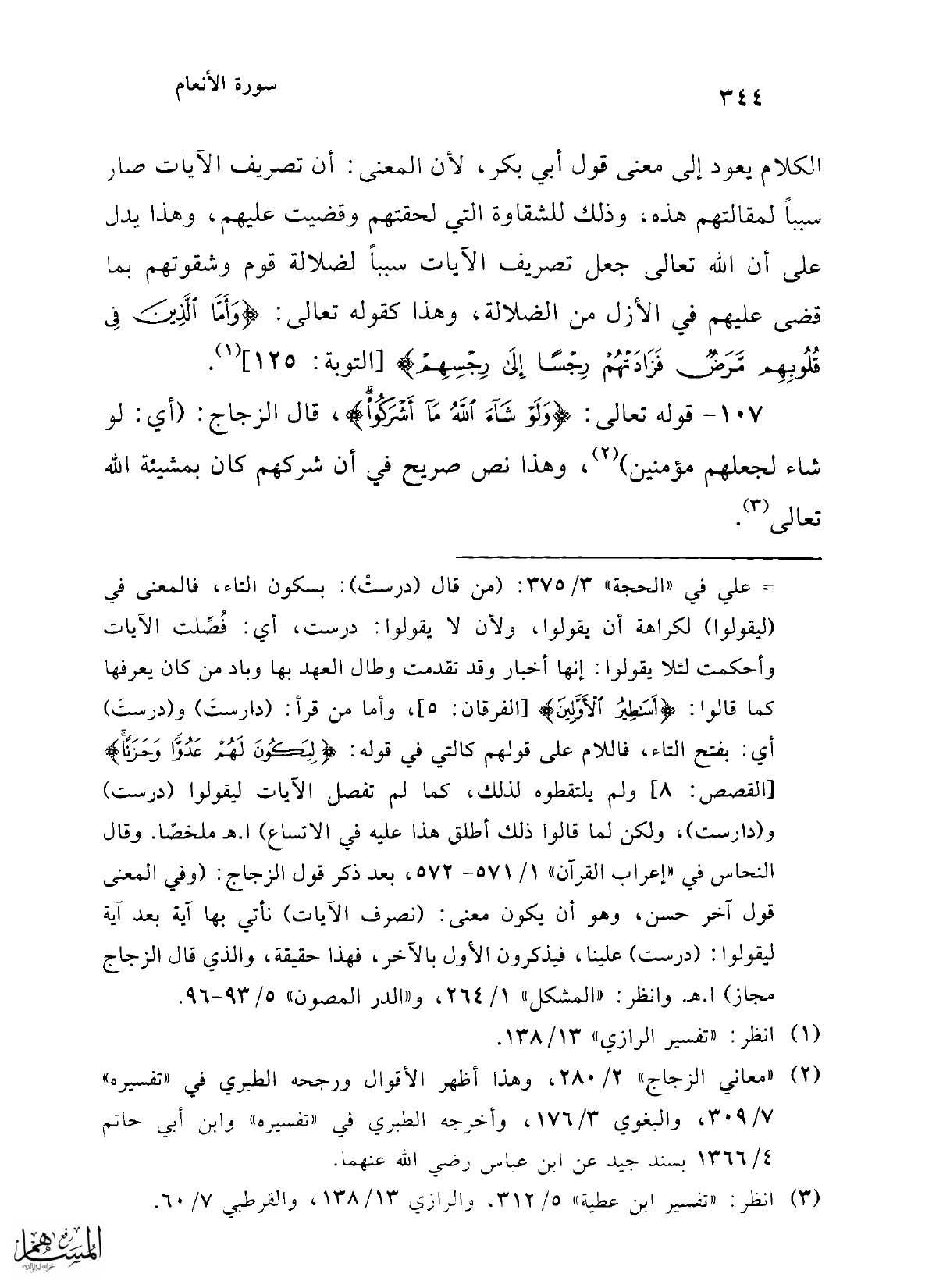 107 - قوله تعالى: {وَلَوْ شَاءَ اللَّهُ مَا أَشْرَكُوا}، قال الزجاج: (أي: لو شاء لجعلهم مؤمنين) (¬2)، وهذا نص صريح في أن شركهم كان بمشيئة الله تعالى (¬3).