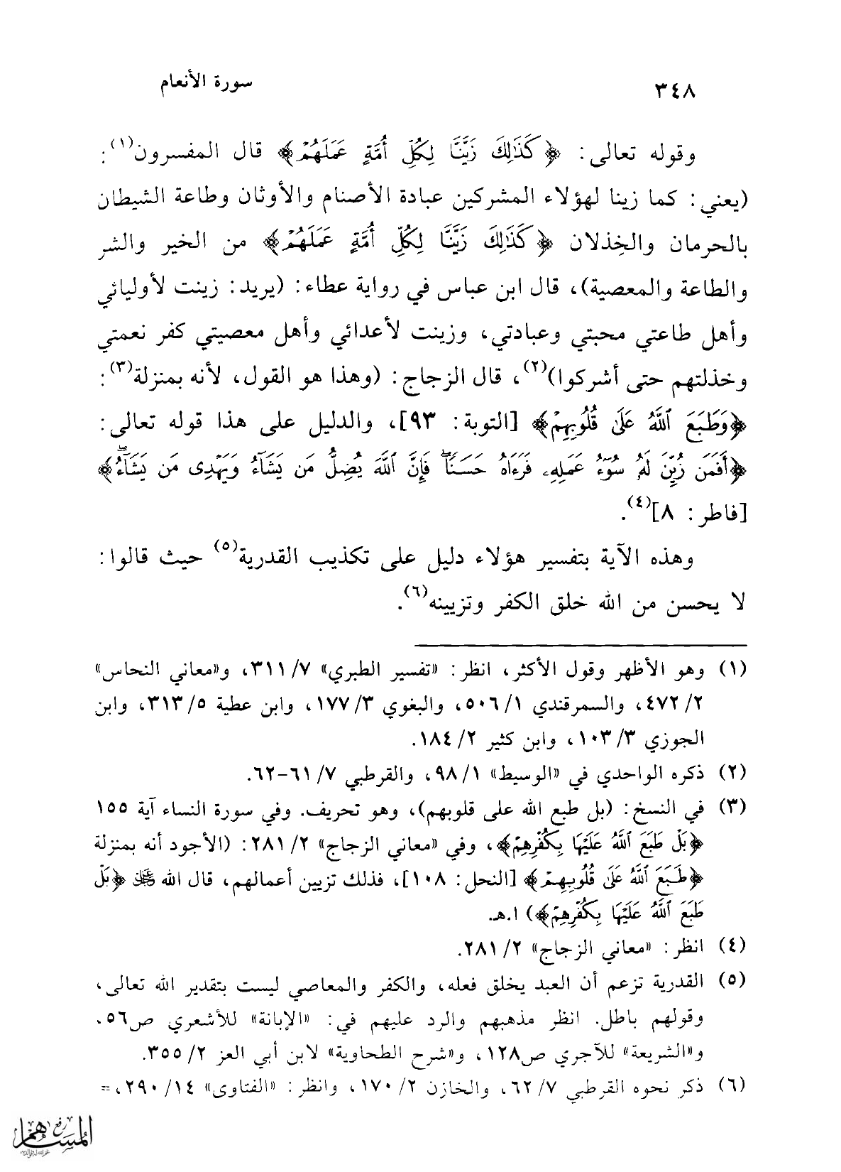 وقوله تعالى: {كَذَلِكَ زَيَّنَّا لِكُلِّ أُمَّةٍ عَمَلَهُمْ} قال المفسرون (¬1). (يعني: كما زينا لهؤلاء المشركين عبادة الأصنام والأوثان وطاعة الشيطان بالحرمان والخِذلان {كَذَلِكَ زَيَّنَّا لِكُلِّ أُمَّةٍ عَمَلَهُمْ} من الخير والشر والطاعة والمعصية)، قال ابن عباس في رواية عطاء: (يريد: زينت لأوليائي وأهل طاعتي محبتي وعبادتي، وزينت لأعدائي وأهل معصيتي كفر نعمتي وخذلتهم حتى أشركوا) (¬2)، قال الزجاج: (وهذا هو القول، لأنه بمنزلة (¬3): {وَطَبَعَ اللَّهُ عَلَى قُلُوبِهِمْ} [التوبة: 93]، والدليل على هذا قوله تعالى: {أَفَمَنْ زُيِّنَ لَهُ سُوءُ عَمَلِهِ فَرَآهُ حَسَنًا فَإِنَّ اللَّهَ يُضِلُّ مَنْ يَشَاءُ وَيَهْدِي مَنْ يَشَاءُ} [فاطر: 8] (¬4).