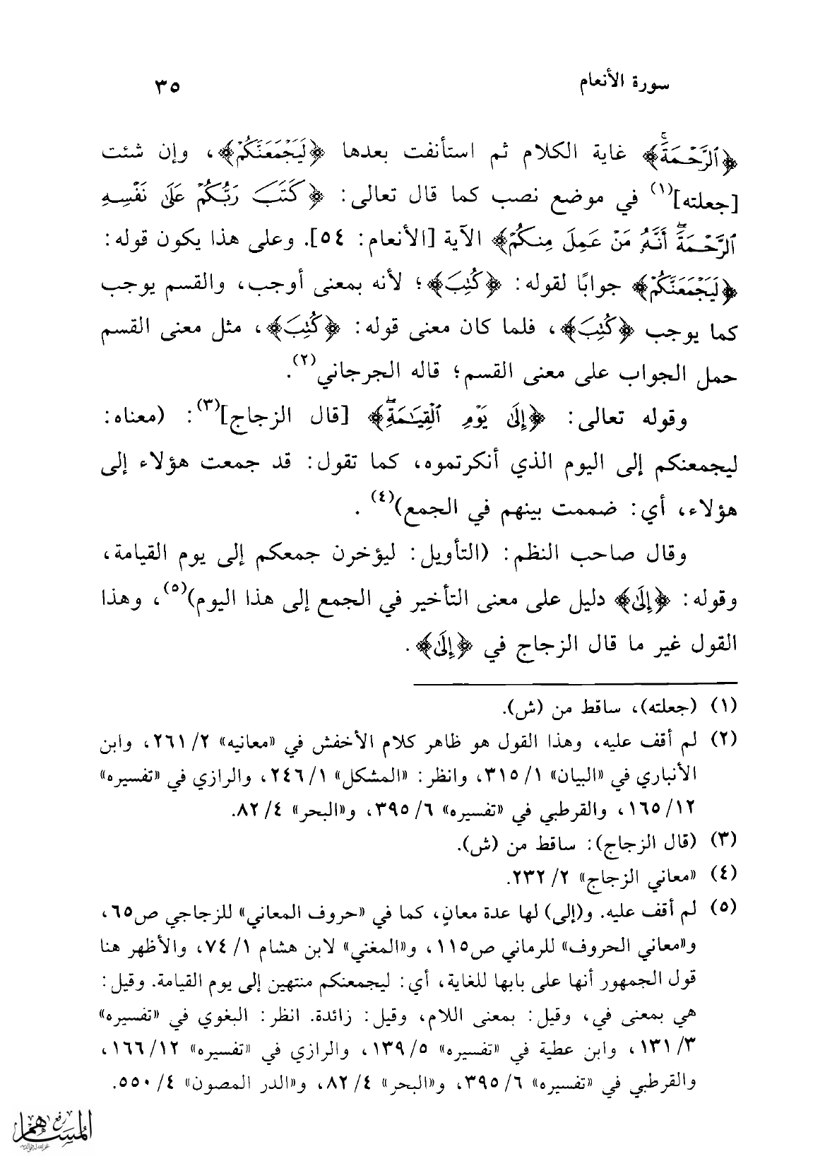 (¬5) لم أقف عليه. و (إلى) لها عدة معانٍ، كما في "حروف المعاني" للزجاجي ص 65، و"معاني الحروف" للرماني ص 115، و"المغني" لابن هشام 1/ 74، والأظهر هنا قول الجمهور أنها على بابها للغاية، أي: ليجمعنكم منتهين إلى يوم القيامة. وقيل: هي بمعنى في، وقيل: بمعنى اللام، وقيل: زائدة. انظر: البغوي في "تفسيره" 3/ 131، وابن عطية في "تفسيره" 5/ 139، والرازي في "تفسيره" 12/ 166، والقرطبي في "تفسيره" 6/ 395، و"البحر" 4/ 82، و"الدر المصون" 4/ 550.