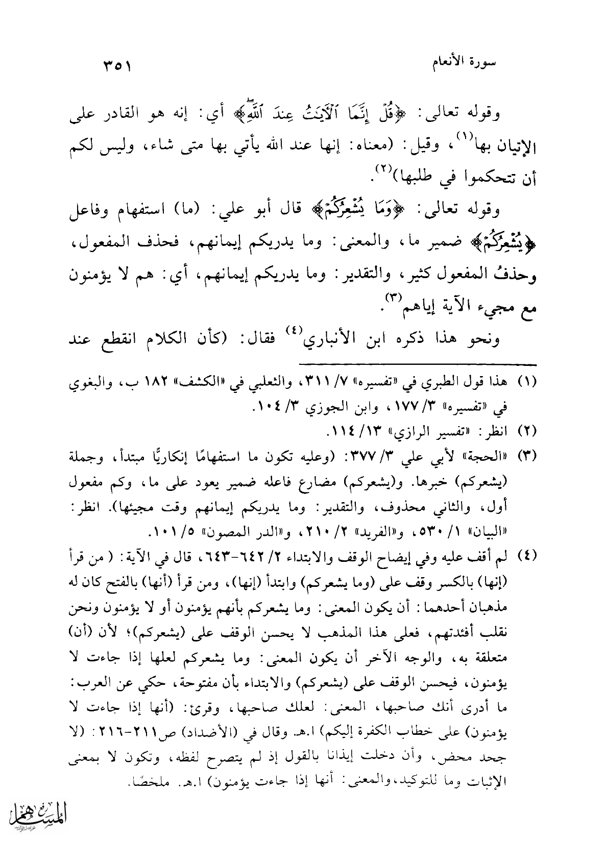(¬4) لم أقف عليه وفي إيضاح الوقف والابتداء 2/ 642 - 643، قال في الآية: (من قرأ (إنها) بالكسر وقف على (وما يشعركم) وابتدأ (إنها)، ومن قرأ (أنها) بالفتح كان له مذهبان أحدهما: أن يكون المعنى: وما يشعركم بأنهم يؤمنون أو لا يؤمنون ونحن نقلب أفئدتهم، فعلى هذا المذهب لا يحسن الوقف على (يشعركم)؛ لأن (أن) متعلقة به، والوجه الآخر أن يكون المعنى: وما يشعركم لعلها إذا جاءت لا يؤمنون، فيحسن الوقف على (يشعركم) والابتداء بأن مفتوحة، حكي عن العرب: ما أدرى أنك صاحبها، المعنى: لعلك صاحبها، وقرئ: (أنها إذا جاءت لا يؤمنون) على خطاب الكفرة إليكم) ا. هـ. وقال في (الأضداد) ص 211 - 216: (لا جحد محض، وأن دخلت إيذانا بالقول إذ لم يصرح لفظه، وتكون لا بمعنى الإثبات وما للتوكيد, والمعنى: أنها إذا جاءت يؤمنون) ا. هـ. ملخصًا.