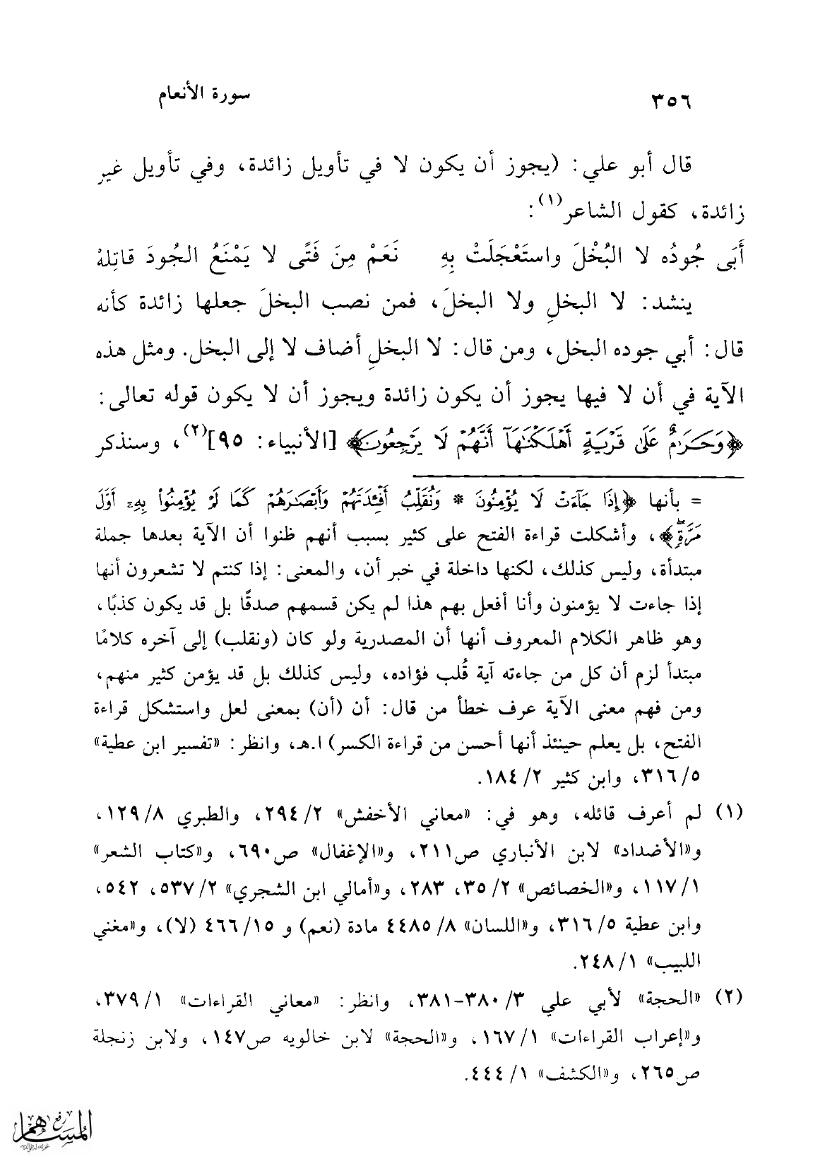 ينشد: لا البخلِ ولا البخلَ، فمن نصب البخلَ جعلها زائدة كأنه قال: أبي جوده البخل، ومن قال: لا البخلِ أضاف لا إلى البخل. ومثل هذه الآية في أن لا فيها يجوز أن يكون زائدة ويجوز أن لا يكون قوله تعالى: {وَحَرَامٌ عَلَى قَرْيَةٍ أَهْلَكْنَاهَا أَنَّهُمْ لَا يَرْجِعُونَ} [الأنبياء: 95]، (¬2)، وسنذكر