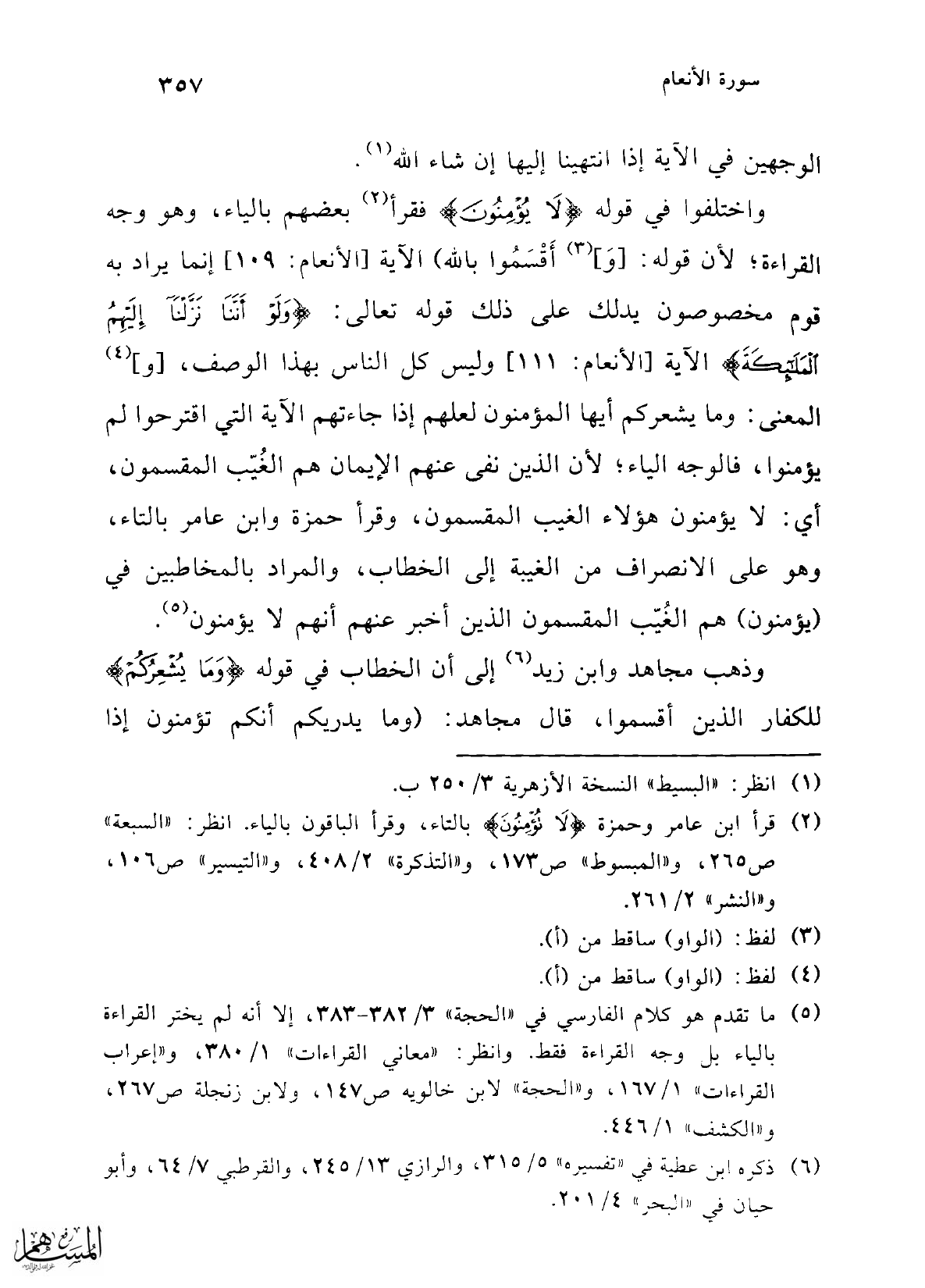 واختلفوا في قوله {لَا يُؤْمِنُونَ} فقرأ (¬2) بعضهم بالياء، وهو وجه القراءة؛ لأن قوله: [و] (¬3) أَقْسَمُوا بالله) الآية [الأنعام: 109] إنما يراد به قوم مخصوصون يدلك على ذلك قوله تعالى: {وَلَوْ أَنَّنَا نَزَّلْنَا إِلَيْهِمُ الْمَلَائِكَةَ} الآية [الأنعام: 111] وليس كل الناس بهذا الوصف، [و] (¬4) المعني: وما يشعركم أيها المؤمنون لعلهم إذا جاءتهم الآية التي اقترحوا لم يؤمنوا، فالوجه الياء؛ لأن الذين نفى عنهم الإيمان هم الغُيّب المقسمون، أي: لا يؤمنون هؤلاء الغيب المقسمون، وقرأ حمزة وابن عامر بالتاء، وهو على الانصراف من الغيبة إلى الخطاب، والمراد بالمخاطبين في (يؤمنون) هم الغُيّب المقسمون الذين أخبر عنهم أنهم لا يؤمنون (¬5).