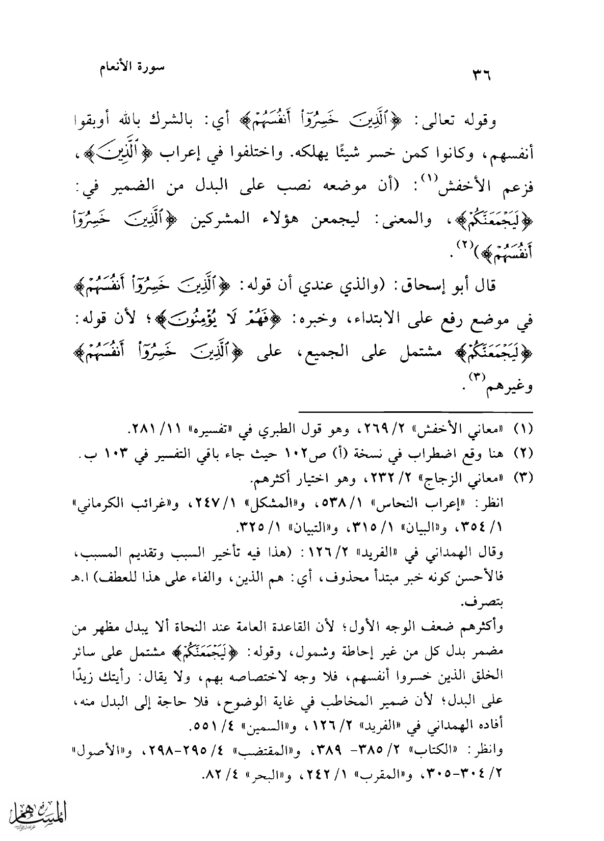 قال أبو إسحاق: (والذي عندي أن قوله: {الَّذِينَ خَسِرُوا أَنْفُسَهُمْ} في موضع رفع على الابتداء، وخبره: {فَهُمْ لَا يُؤْمِنُونَ}؛ لأن قوله: {لَيَجْمَعَنَّكُمْ} مشتمل على الجميع، على {الَّذِينَ خَسِرُوا أَنْفُسَهُمْ} وغيرهم (¬3).