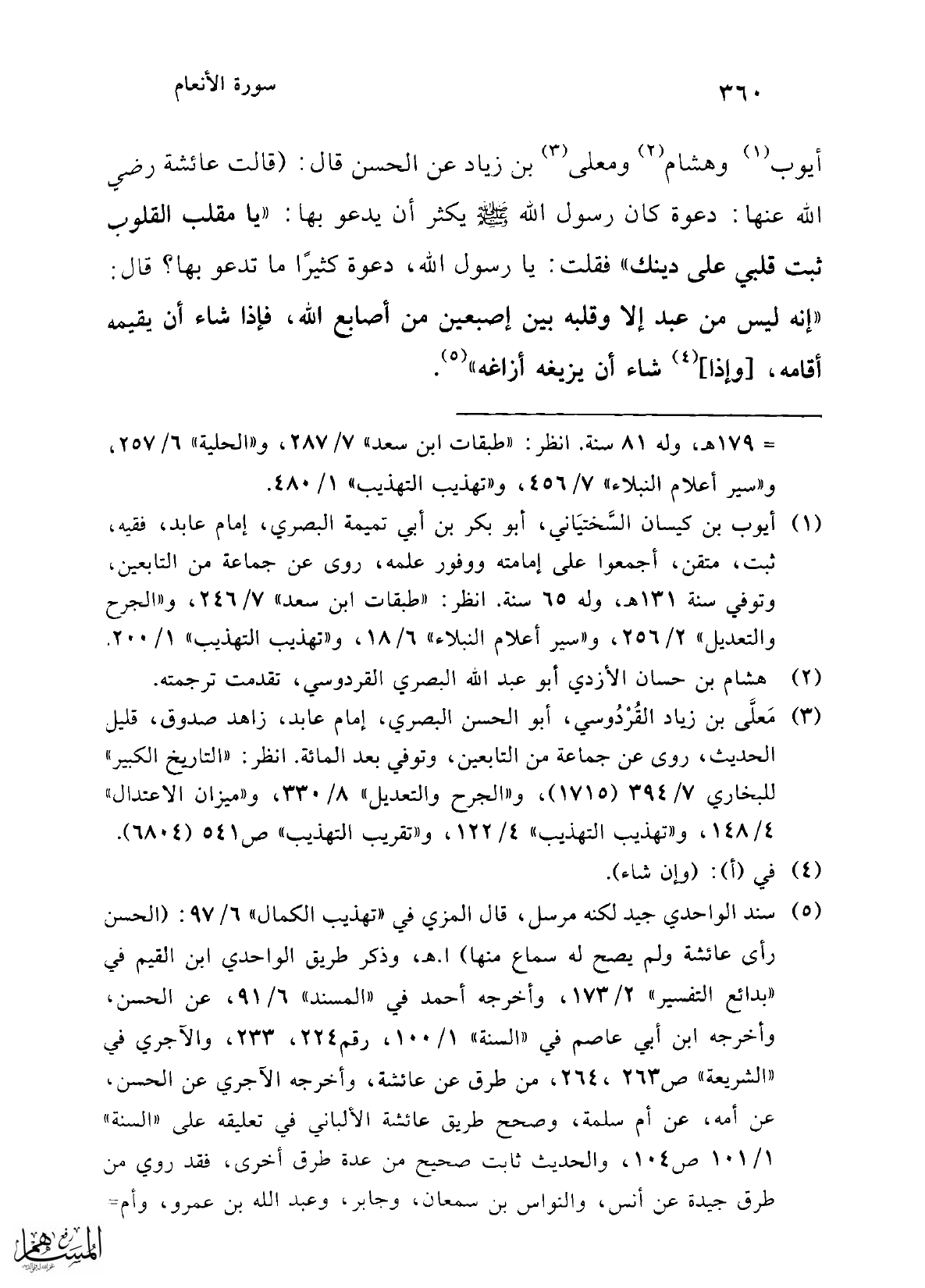 أيوب (¬1) وهشام (¬2) ومعلى (¬3) بن زياد عن الحسن قال: (قالت عائشة رضي الله عنها: دعوة كان رسول الله - صلى الله عليه وسلم - يكثر أن يدعو بها: "يا مقلب القلوب ثبت قلبي على دينك" فقلت: يا رسول الله، دعوة كثيراً ما تدعو بها؟ قال: "إنه ليس من عبد إلا وقلبه بين إصبعين من أصابع الله، فإذا شاء أن يقيمه أقامه، [وإذا] (¬4) شاء أن يزيغه أزاغه" (¬5).