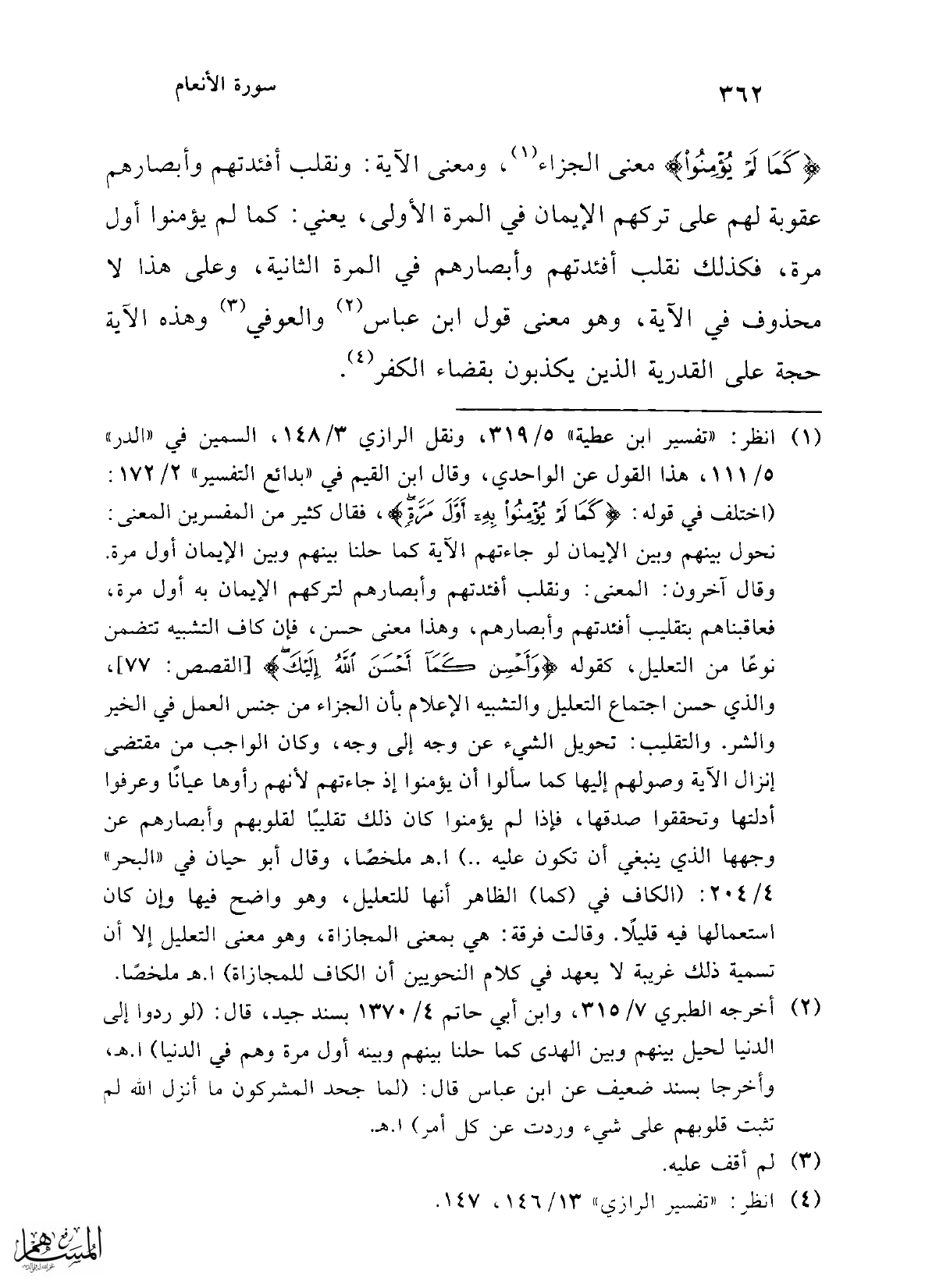 (¬2) أخرجه الطبري 7/ 315، وابن أبي حاتم 4/ 1370 بسند جيد، قال: (لو ردوا إلى الدنيا لحيل بينهم وبين الهدى كما حلنا بينهم وبينه أول مرة وهم في الدنيا) ا. هـ , وأخرجا بسند ضعيف عن ابن عباس قال: (لما جحد المشركون ما أنزل الله لم تثبت قلوبهم على شيء وردت عن كل أمر) ا. هـ.