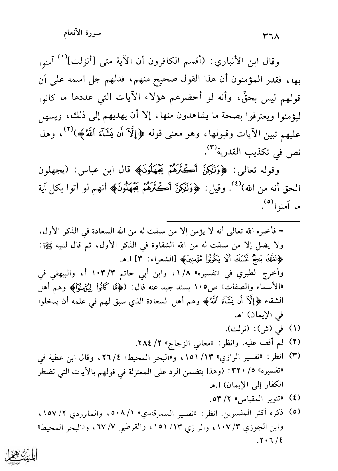 وقال ابن الأنباري: (أقسم الكافرون أن الآية متى [أنزلت] (¬1) آمنوا بها، فقدر المؤمنون أن هذا القول صحيح منهم، فدلهم جل اسمه على أن قولهم ليس بحقٍّ، وأنه لو أحضرهم هؤلاء الآيات التي عددها ما كانوا ليؤمنوا ويعترفوا بصحة ما يشاهدون منها، إلا أن يهديهم إلى ذلك، ويسهل عليهم تبين الآيات وقبولها، وهو معنى قوله {إِلَّا أَنْ يَشَاءَ اللَّهُ}) (¬2)، وهذا نص في تكذيب القدرية (¬3).