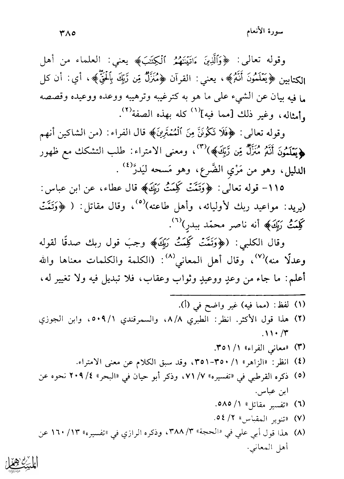 115 - قوله تعالى: {وَتَمَّتْ كَلِمَتُ رَبِّكَ} قال عطاء، عن ابن عباس: (يريد: مواعيد ربك لأوليائه، وأهل طاعته) (¬5)، وقال مقاتل: ({وَتَمَّتْ كَلِمَتُ رَبِّكَ} أنه ناصر محمّد ببدرٍ) (¬6).