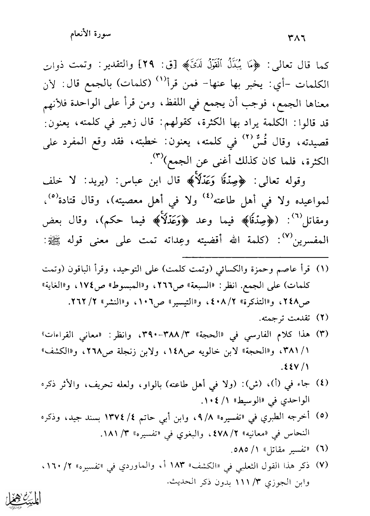 كما قال تعالى: {مَا يُبَدَّلُ الْقَوْلُ لَدَيَّ} [ق: 29] والتقدير: وتمت ذوات الكلمات -أي: يخبر بها عنها- فمن قرأ (¬1) (كلمات) بالجمع قال: لأن معناها الجمع، فوجب أن يجمع في اللفظ، ومن قرأ على الواحدة فلأنهم قد قالوا: الكلمة يراد بها الكثرة، كقولهم: قال زهير في كلمته، يعنون: قصيدته، وقال قُسٌّ (¬2) في كلمته، يعنون: خطبته، فقد وقع المفرد على الكثرة، فلما كان كذلك أغنى عن الجمع) (¬3).