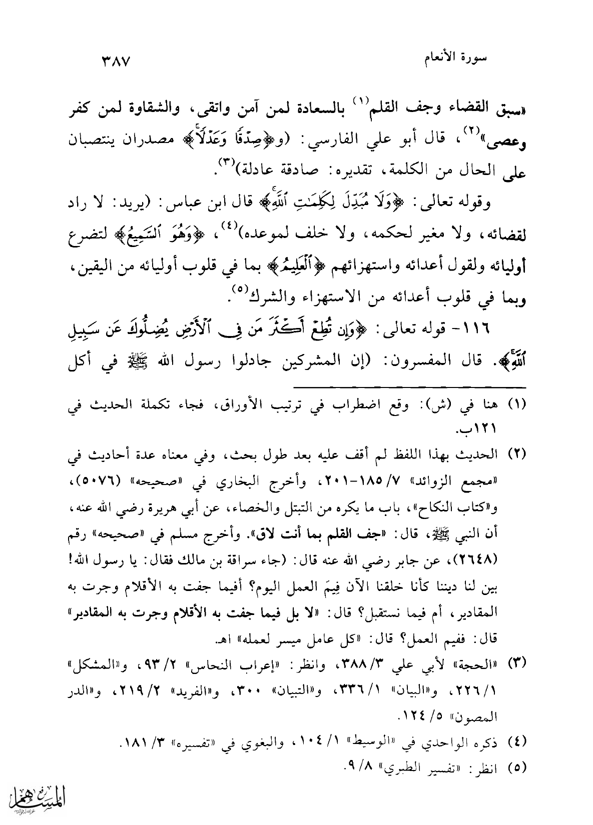 "سبق القضاء وجف القلم (¬1) بالسعادة لمن آمن واتقى، والشقاوة لمن كفر وعصى" (¬2)، قال أبو علي الفارسي: (و {صِدْقًا وَعَدْلًا} مصدران ينتصبان علي الحال من الكلمة، تقديره: صادقة عادلة) (¬3).