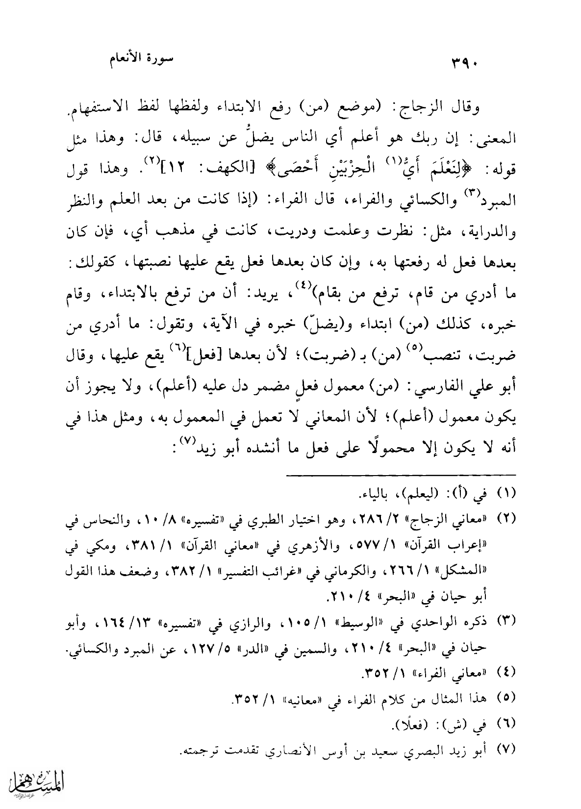 وقال الزجاج: (موضع (من) رفع الابتداء ولفظها لفظ الاستفهام. المعنى: إن ربك هو أعلم أي الناس يضلُّ عن سبيله، قال: وهذا مثل قوله: {لِنَعْلَمَ أَيُّ (¬1) الْحِزْبَيْنِ أَحْصَى} [الكهف: 12] (¬2). وهذا قول المبرد (¬3) والكسائي والفراء، قال الفراء: (إذا كانت من بعد العلم والنظر والدراية، مثل: نظرت وعلمت ودريت، كانت في مذهب أي، فإن كان بعدها فعل له رفعتها به، وإن كان بعدها فعل يقع عليها نصبتها، كقولك: ما أدري من قام، ترفع من بقام) (¬4)، يريد: أن من ترفع بالابتداء، وقام خبره، كذلك (من) ابتداء و (يضلّ) خبره في الآية، وتقول: ما أدري من ضربت، تنصب (¬5) (من) بـ (ضربت)؛ لأن بعدها [فعل] (¬6) يقع عليها، وقال أبو علي الفارسي: (من) معمول فعلٍ مضمر دل عليه (أعلم)، ولا يجوز أن يكون معمول (أعلم)؛ لأن المعاني لا تعمل في المعمول به، ومثل هذا في أنه لا يكون إلا محمولًا على فعل ما أنشده أبو زيد (¬7):
