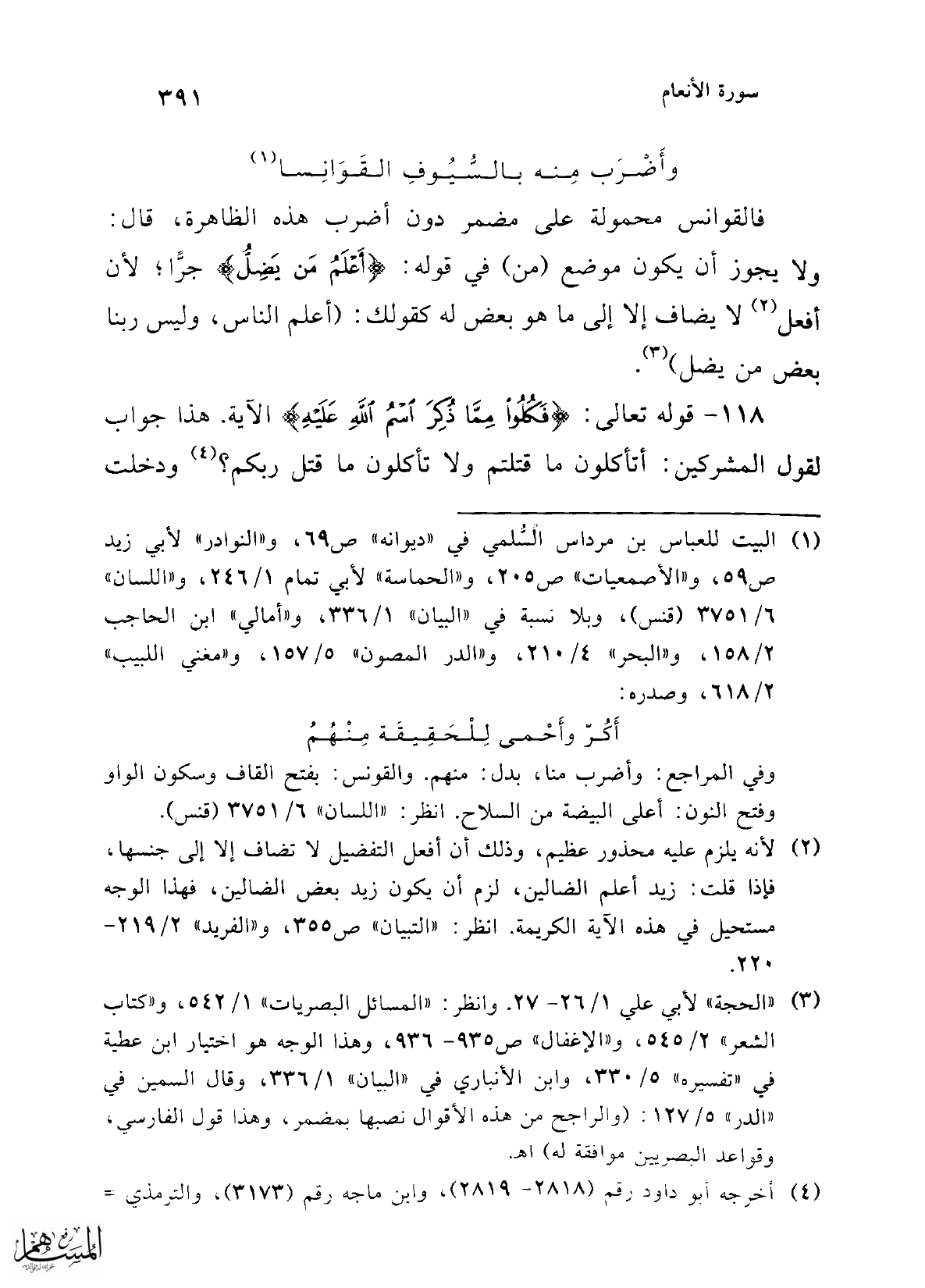 فالقوانس محمولة على مضمر دون أضرب هذه الظاهرة، قال. ولا يجوز أن يكون موضع (من) في قوله: {أَعْلَمُ مَنْ يَضِلُّ} جرًّا؛ لأن أفعل (¬2) لا يضاف إلا إلى ما هو بعض له كقولك: (أعلم الناس، وليس ربنا بعض من يضل) (¬3).
