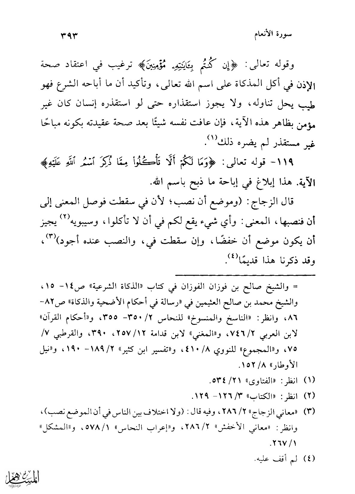 = والشيخ صالح بن فوزان الفوزان في كتاب "الذكاة الشرعية" ص 14 - 15، والشيخ محمد بن صالح العثيمين في "رسالة في أحكام الأضحية والذكاة" ص 82 - 86، وانظر: "الناسخ والمنسوخ" للنحاس 2/ 350 - 355، و"أحكام القرآن" لابن العربي 2/ 746، و"المغني" لابن قدامة 12/ 257، 390، والقرطبي 7/ 75، و"المجموع" للنووي 8/ 410، و"تفسير ابن كثير" 2/ 189 - 190، و"نيل الأوطار" 8/ 152.
