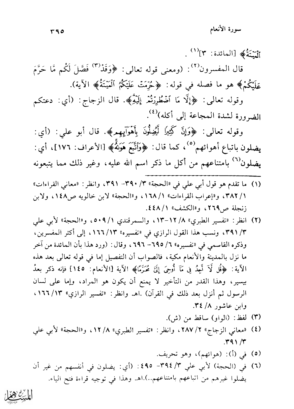 (¬2) انظر: "تفسير الطبري" 8/ 12 - 13، والسمرقندي 1/ 509، و"الحجة" لأبي علي 3/ 391، ونسب هذا القول الرازي في "تفسيره" 13/ 166، إلى أكثر المفسرين، وذكره القاسمي في "تفسيره" 6/ 695 - 696، وقال: (ورد هذا بأن المائدة من آخر ما نزل بالمدينة والأنعام مكية، فالصواب أن التفصيل إما في قوله تعالى بعد هذه الآية: {قُلْ لَا أَجِدُ فِي مَا أُوحِيَ إِلَيَّ مُحَرَّمًا} الآية [الأنعام: 145] فإنه ذكر بعدُ بيسير، وهذا القدر من التأخير لا يمنع أن يكون هو المراد، وإما على لسان الرسول ثم أنزل بعد ذلك في القرآن). اهـ. وانظر: "تفسير الرازي" 13/ 166، وابن عاشور 8/ 34.