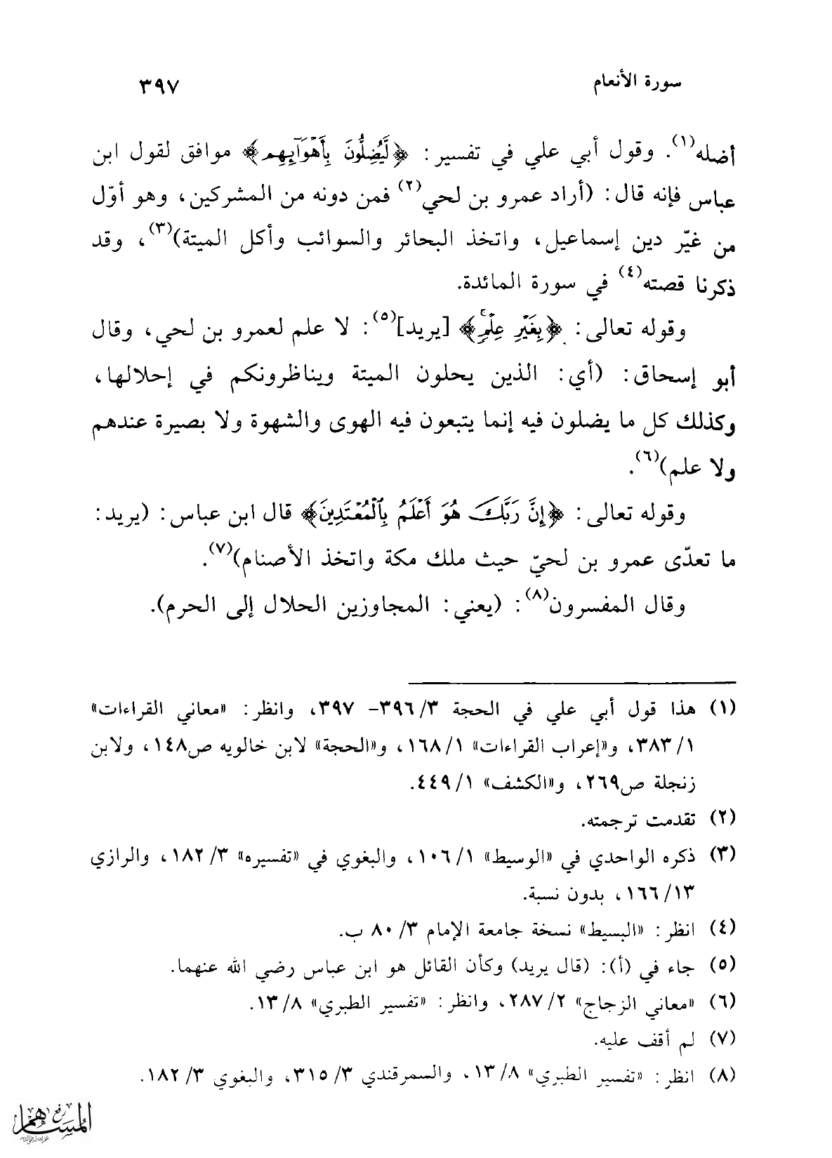 أضله (¬1). وقول أبي علي في تفسير: {لَيُضِلُّونَ بِأَهْوَائِهِمْ} موافق لقول ابن عباس فإنه قال: (أراد عمرو بن لحي (¬2) فمن دونه من المشركين، وهو أوّل من غيّر دين إسماعيل، واتخذ البحائر والسوائب وأكل الميتة) (¬3)، وقد ذكرنا قصته (¬4) في سورة المائدة.