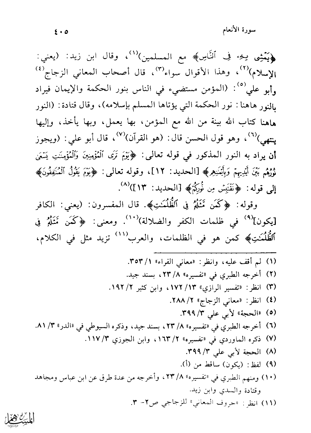 {يَمْشِي بِهِ فِي النَّاسِ} مع المسلمين) (¬1)، وقال ابن زيد: (يعني: الإِسلام) (¬2)، وهذا الأقوال سواء (¬3)، قال أصحاب المعاني الزجاج (¬4) وأبو علي (¬5): (المؤمن مستضيء في الناس بنور الحكمة والإيمان فيراد بالنور هاهنا: نور الحكمة التي يؤتاها المسلم بإسلامه)، وقال قتادة: (النور هاهنا كتاب الله بينة من الله مع المؤمن، بها يعمل، وبها يأخذ، وإليها ينتهي) (¬6)، وهو قول الحسن قال: (هو القرآن) (¬7)، قال أبو علي: (ويجوز أن يراد به النور المذكور في قوله تعالى: {يَوْمَ تَرَى الْمُؤْمِنِينَ وَالْمُؤْمِنَاتِ يَسْعَى نُورُهُمْ بَيْنَ أَيْدِيهِمْ وَبِأَيْمَانِهِمْ} [الحديد: 12]، وقوله تعالى: {يَوْمَ يَقُولُ الْمُنَافِقُونَ} إلى قوله: {نَقْتَبِسْ مِنْ نُورِكُمْ} [الحديد: 13]) (¬8).
