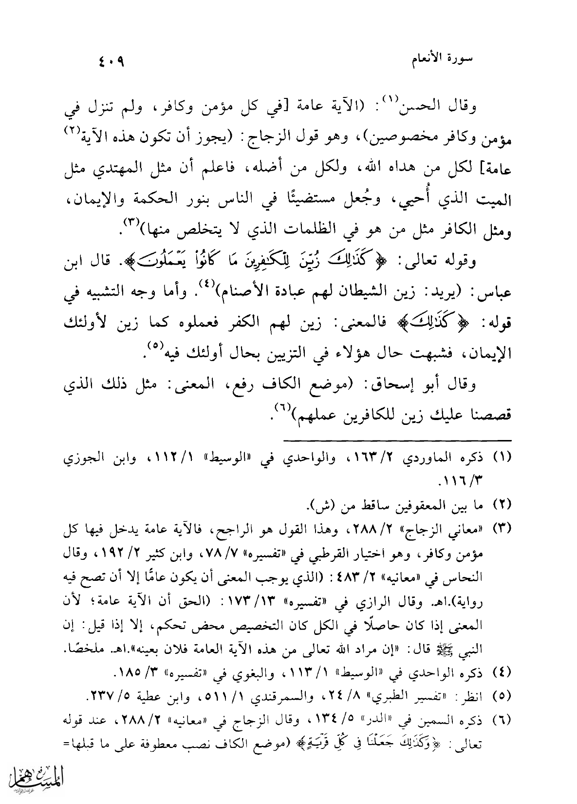 وقوله تعالى: {كَذَلِكَ زُيِّنَ لِلْكَافِرِينَ مَا كَانُوا يَعْمَلُونَ}. قال ابن عباس: (يريد: زين الشيطان لهم عبادة الأصنام) (¬4). وأما وجه التشبيه في قوله: {كَذَلِكَ} فالمعنى: زين لهم الكفر فعملوه كما زين لأولئك الإيمان, فشبهت حال هؤلاء في التزيين بحال أولئك فيه (¬5).