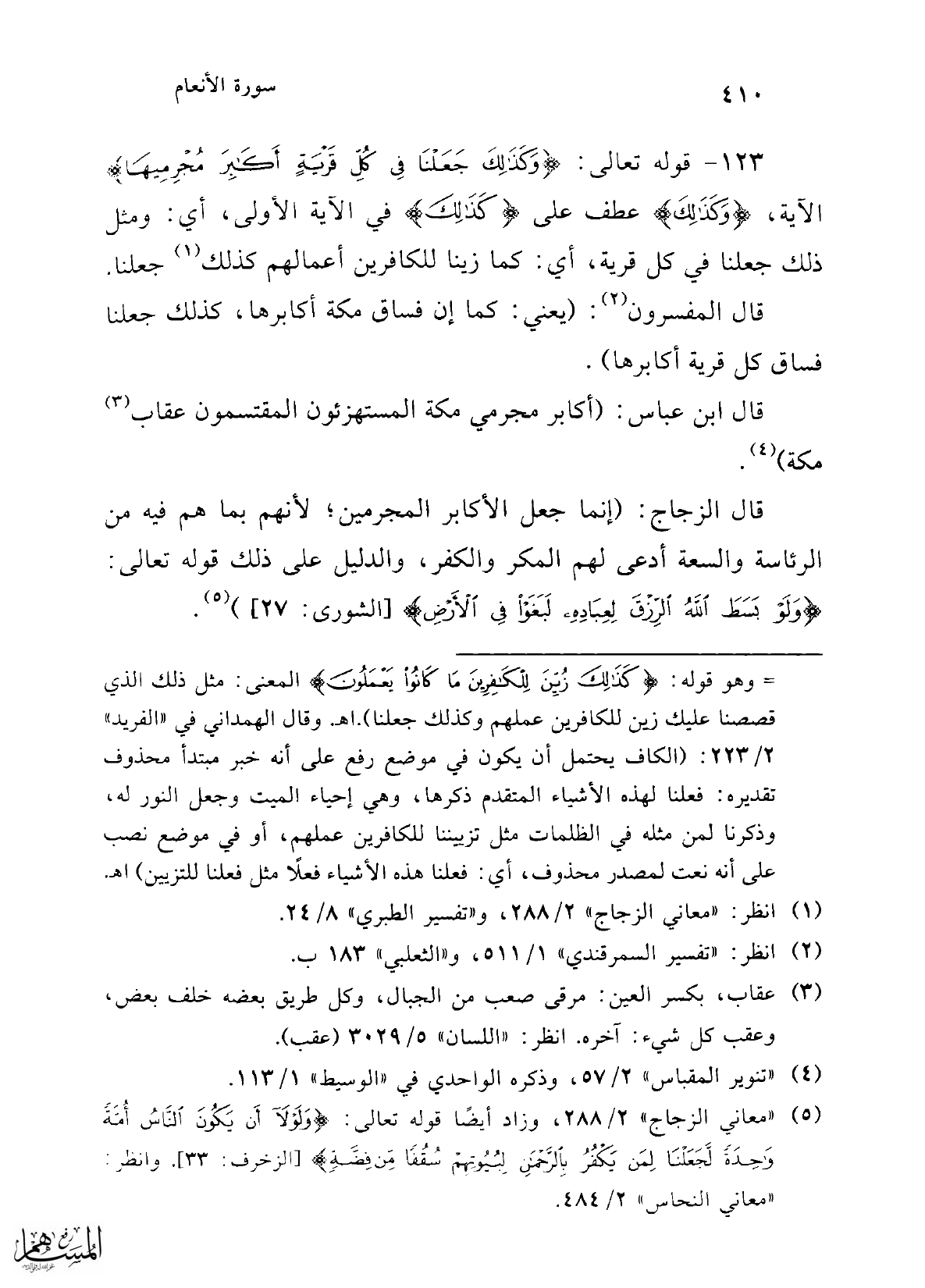 123 - قوله تعالى: {وَكَذَلِكَ جَعَلْنَا فِي كُلِّ قَرْيَةٍ أَكَابِرَ مُجْرِمِيهَا} الآية، {وَكَذَلِكَ} عطف على {كَذَلِكَ} في الآية الآولى، أي: ومثل ذلك جعلنا في كل قرية، أي: كما زينا للكافرين أعمالهم كذلك (¬1) جعلنا.
