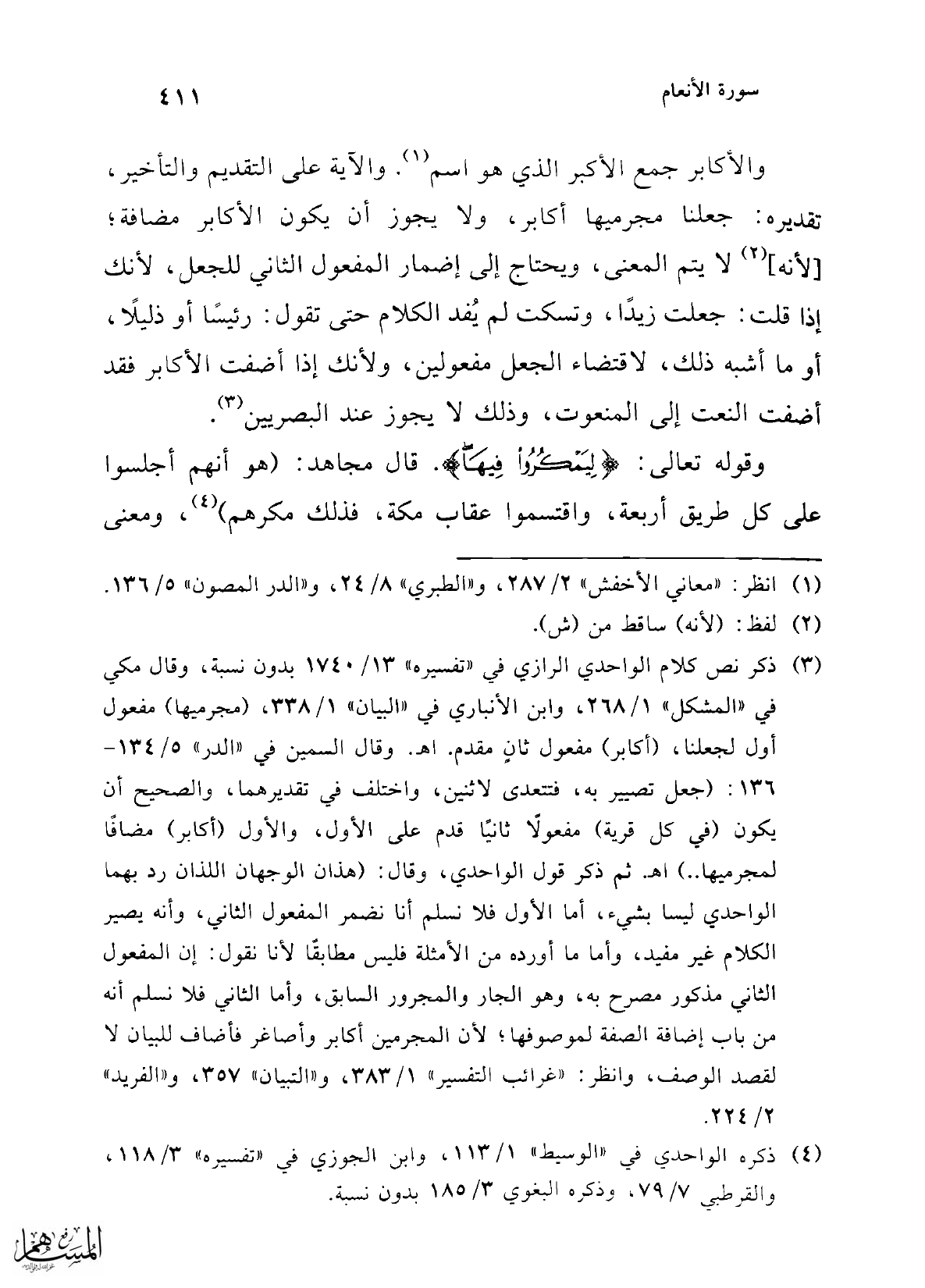 (¬3) ذكر نص كلام الواحدي الرازي في "تفسيره" 13/ 1740 بدون نسبة، وقال مكي في "المشكل" 1/ 268، وابن الأنباري في "البيان" 1/ 338، (مجرميها) مفعول أول لجعلنا، (أكابر) مفعول ثانٍ مقدم. اهـ. وقال السنن في "الدر" 5/ 134 - 136: (جعل تصيير به، فتتعدى لاثنين، واختلف في تقديرهما، والصحيح أن يكون (في كل قرية) مفعولا ثانيًا قدم على الأول، والأول (أكابر) مضافًا لمجرميها ..) اهـ. ثم ذكر قول الواحدي، وقال: (هذان الوجهان اللذان رد بهما الواحدي ليسا بشيء، أما الأول فلا نسلم أنا نضمر المفعول الثاني، وأنه يصير الكلام غير مفيد، وأما ما أورده من الأمثلة فليس مطابقًا لأنا نقول: إن المفعول الثاني مذكور مصرح به، وهو الجار والمجرور السابق، وأما الثاني فلا نسلم أنه من باب إضافة الصفة لموصوفها؛ لأن المجرمين أكابر وأصاغر فأضاف للبيان لا لقصد الوصف، وانظر: "غرائب التفسير" 1/ 383، و"التبيان" 357، و"الفريد" 2/ 224.