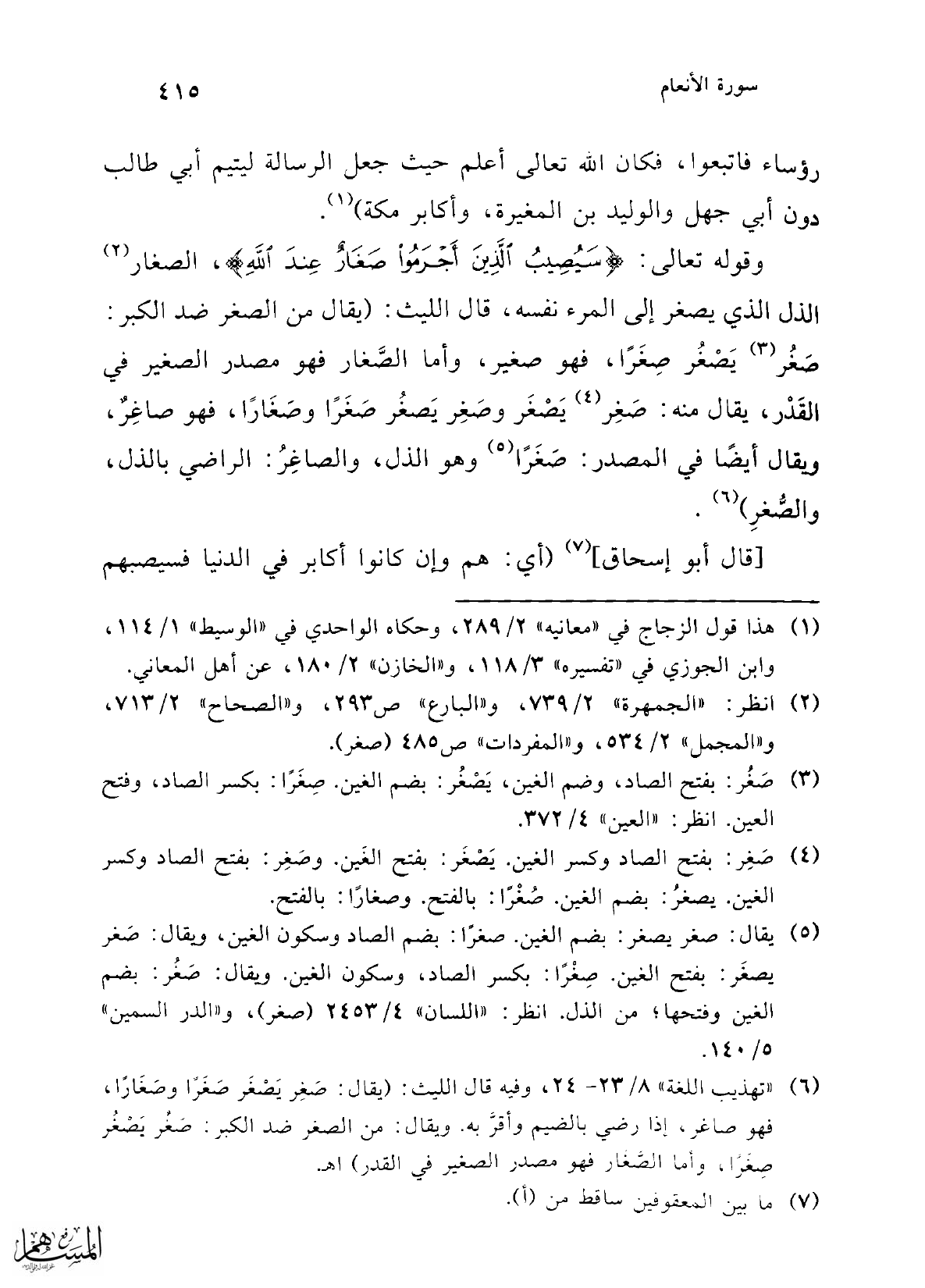 (¬6) "تهذيب اللغة" 8/ 23 - 24، وفيه قال الليث: (يقال: صَغر يَصْغَر صَغَرًا وصَغَارًا، فهو صاغر، إذا رضي بالضيم وأقرَّ به. ويقال: من الصغر ضد الكبر. صَغُر يَصْغُر صِغَرًا، وأما الصَّغَار فهو مصدر الصغير في القدر) اهـ.