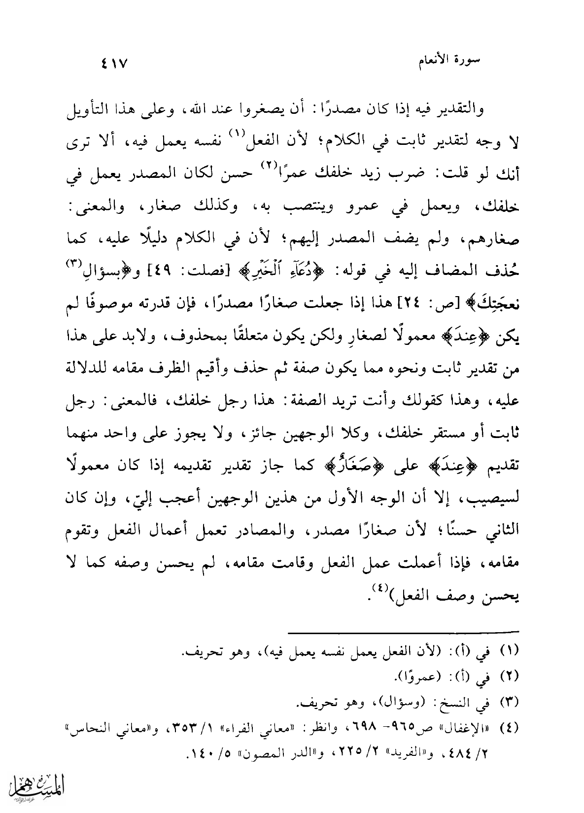 والتقدير فيه إذا كان مصدرًا: أن يصغروا عند الله، وعلى هذا التأويل لا وجه لتقدير ثابت في الكلام؛ لأن الفعل (¬1) نفسه يعمل فيه، ألا ترى أنك لو قلت: ضرب زيد خلفك عمرًا (¬2) حسن لكان المصدر يعمل في خلفك، ويعمل في عمرو وينتصب به، وكذلك صغار، والمعنى: صغارهم، ولم يضف المصدر إليهم؛ لأن في الكلام دليلًا عليه، كما حُذف المضاف إليه في قوله: {دُعَاءِ الْخَيْرِ} [فصلت: 49] و {بِسُؤَالِ (¬3) نَعْجَتِكَ} [ص: 24] هذا إذا جعلت صغارًا مصدرًا، فإن قدرته موصوفًا لم يكن {عِندَ} معمولًا لصغارِ ولكن يكون متعلقَّا بمحذوف، ولابد على هذا من تقدير ثابت ونحوه مما يكون صفة ثم حذف وأقيم الظرف مقامه للدلالة عليه، وهذا كقولك وأنت تريد الصفة: هذا رجل خلفك، فالمعنى: رجل ثابت أو مستقر خلفك، وكلا الوجهين جائز، ولا يجوز على واحد منهما تقديم {عِندَ} على {صَغَارٌ} كما جاز تقدير تقديمه إذا كان معمولًا لسيصيب، إلا أن الوجه الأول من هذين الوجهين أعجب إليّ، وإن كان الثاني حسنًا؛ لأن صغارًا مصدر، والمصادر تعمل أعمال الفعل وتقوم مقامه، فإذا أعملت عمل الفعل وقامت مقامه، لم يحسن وصفه كما لا يحسن وصف الفعل) (¬4).