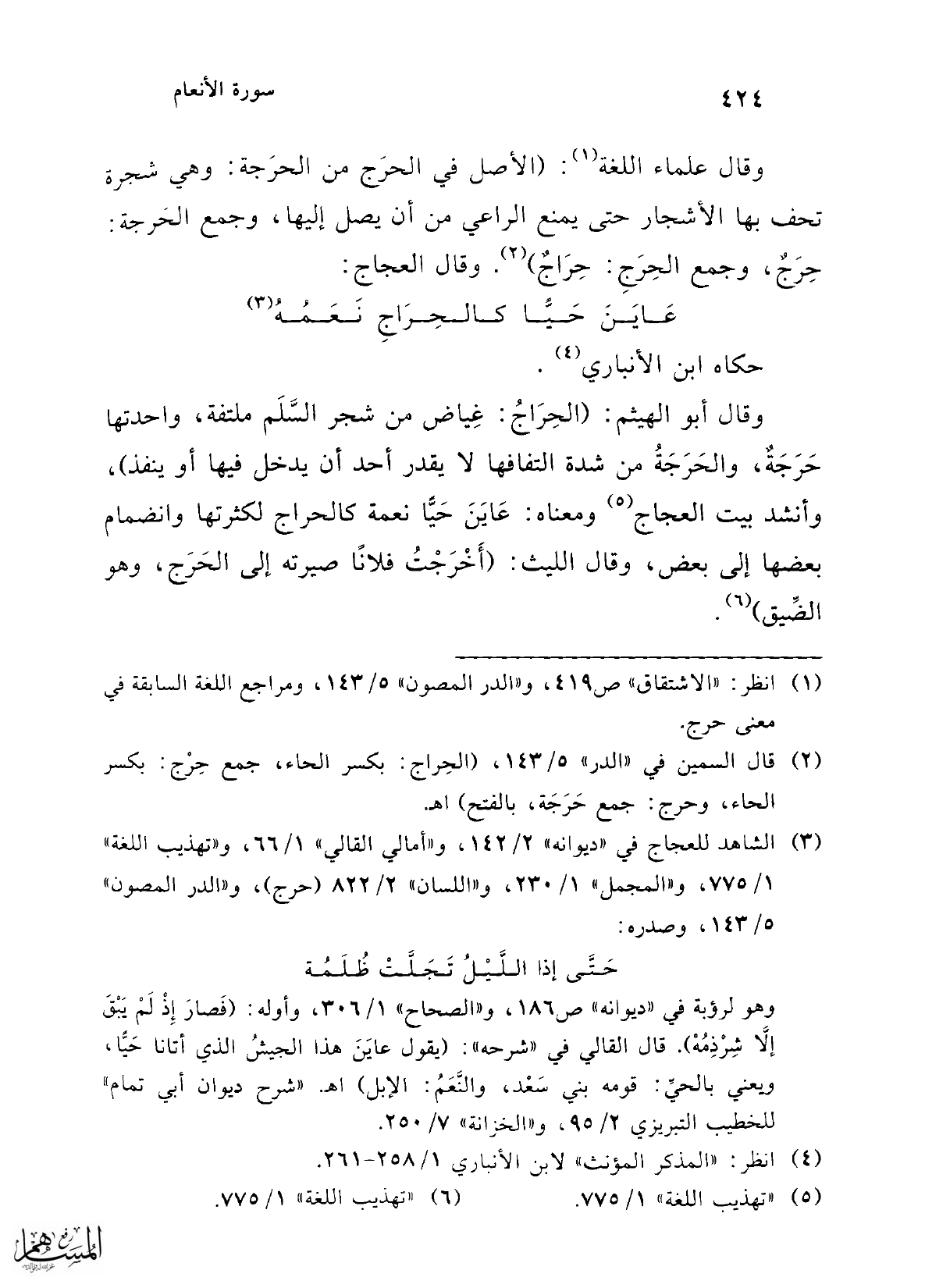 وقال علماء اللغة (¬1): (الأصل في الحرَج من الحرَجة: وهي شجرة تحف بها الأشجار حتى يمنع الراعي من أن يصل إليها، وجمع الحَرجة: حِرَجٌ، وجمع الحِرَجِ: حِرَاجٌ) (¬2). وقال العجاج: