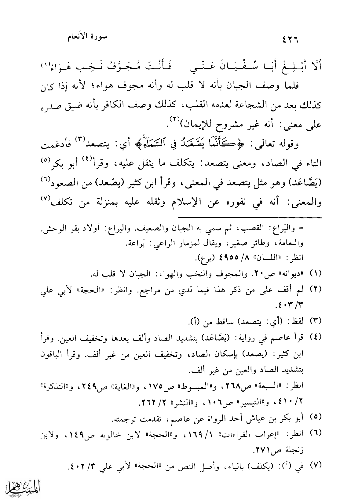 (¬4) قرأ عاصم في رواية: (يَصَّاعَد) بتشديد الصاد وألف بعدها وتخفيف العين. وقرأ ابن كثير: (يصعد) بإسكان الصاد، وتخفيف العين من غير ألف. وقرأ الباقون بتشديد الصاد والعين من غير ألف.