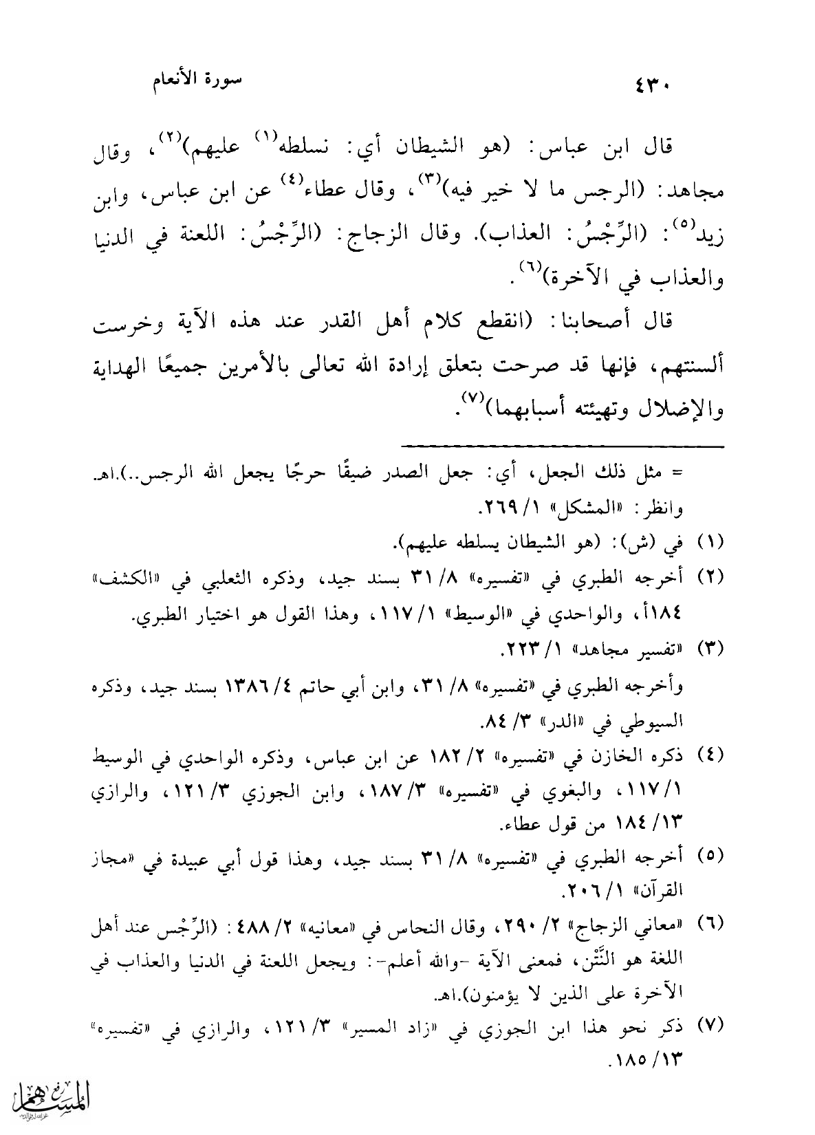 (¬6) "معاني الزجاج" 2/ 290، وقال النحاس في "معانيه" 2/ 488: (الرِّجْس عند أهل اللغة هو النَّتْن، فمعنى الآية -والله أعلم-: ويجعل اللعنة في الدنيا والعذاب في الآخرة على الذين لا يؤمنون). اهـ.