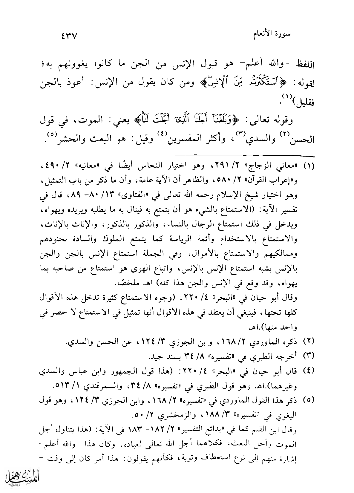 (¬1) "معاني الزجاج" 2/ 291، وهو اختيار النحاس أيضًا في "معانيه" 2/ 490، و"إعراب القرآن" 2/ 580، والظاهر أن الآية عامة، وأن ما ذكر من باب التمثيل، وهو اختيار شيخ الإسلام رحمه الله تعالى في "الفتاوى" 13/ 80 - 89، قال في تفسير الآية: (الاستمتاع بالشيء هو أن يتمتع به فينال به ما يطلبه ويريده ويهواه، ويدخل في ذلك استمتاع الرجال بالنساء، والذكور بالذكور، والإناث بالإناث، والاستمتاع بالاستخدام وأئمة الرياسة كما يتمتع الملوك والسادة بجنودهم وممالكيهم والاستمتاع بالأموال، وفي الجملة استمتاع الإنس بالجن والجن بالإنس يشبه استمتاع الإنس بالإنس، واتباع الهوى هو استمتاع من صاحبه بما يهواه، وقد وقع في الإنس والجن هذا كله) اهـ. ملخصًا.