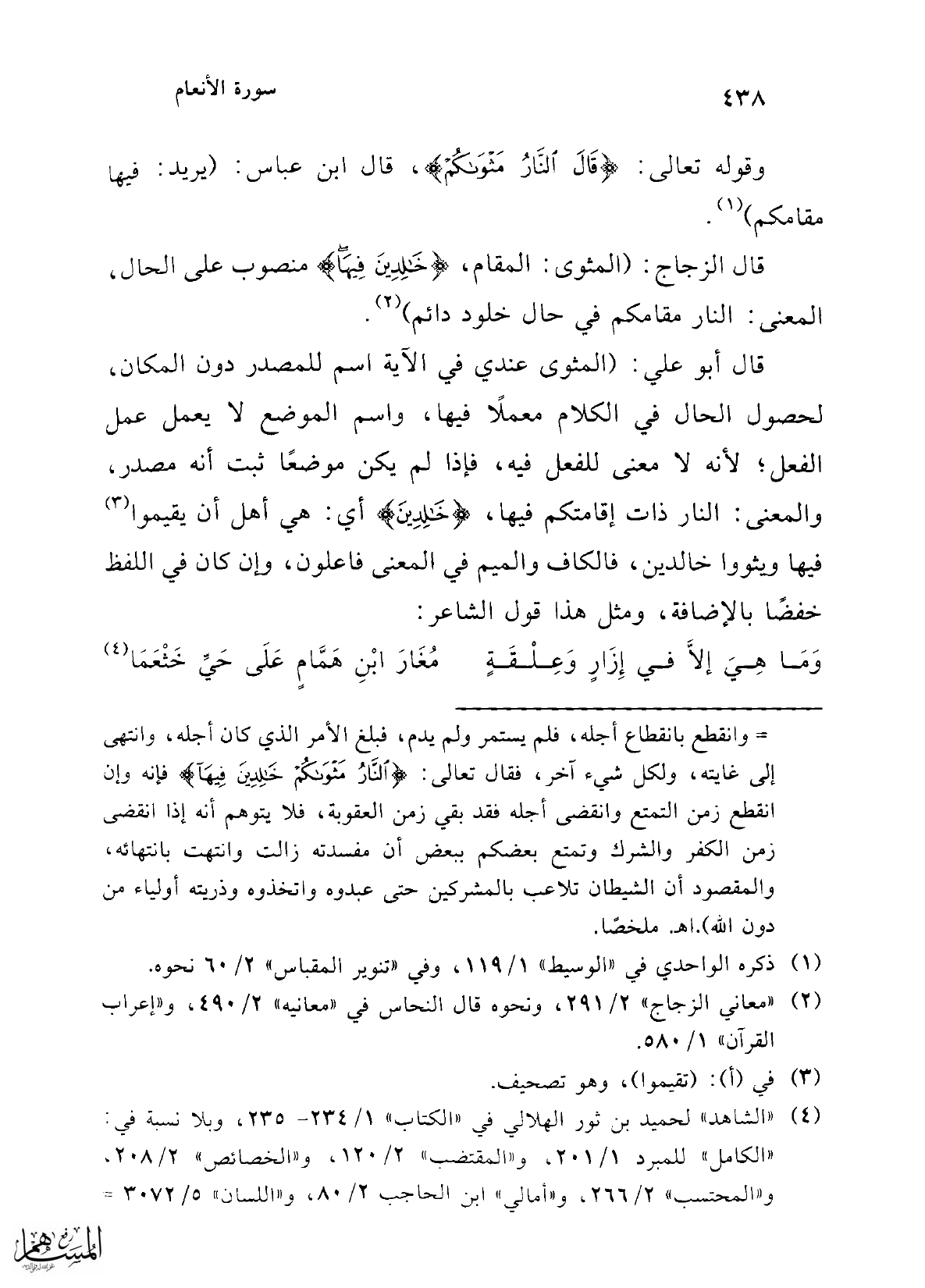 قال أبو علي: (المثوى عندي في الآية اسم للمصدر دون المكان، لحصول الحال في الكلام معملًا فيها، واسم الموضع لا يعمل عمل الفعل؛ لأنه لا معنى للفعل فيه، فإذا لم يكن موضعًا ثبت أنه مصدر، والمعنى: النار ذات إقامتكم فيها، {خَالِدِينَ} أي: هي أهل أن يقيموا (¬3) فيها ويثووا خالدين، فالكاف والميم في المعنى فاعلون، وإن كان في اللفظ خفضًا بالإضافة، ومثل هذا قول الشاعر: