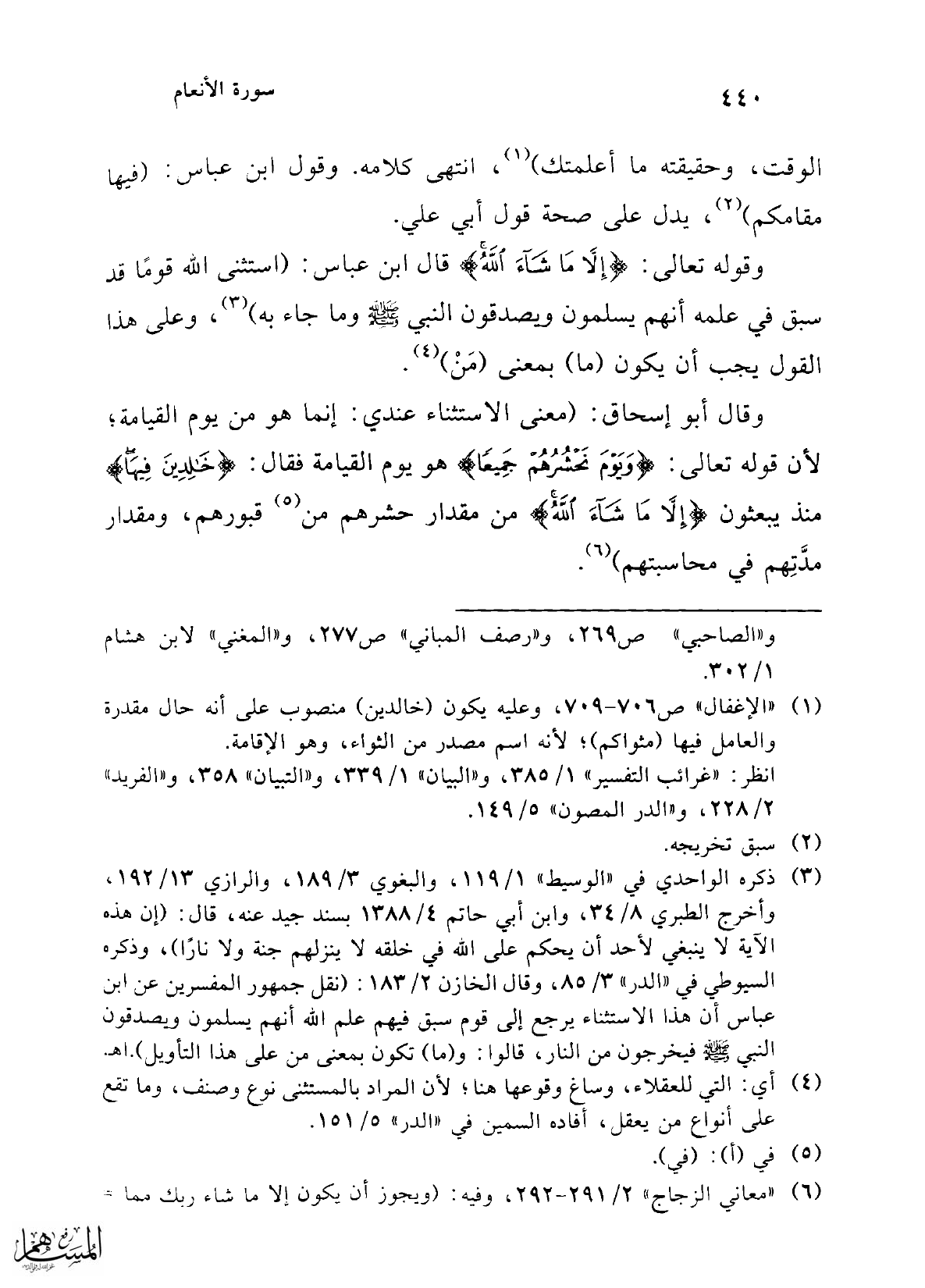 (¬3) ذكره الواحدي في "الوسيط" 1/ 119، والبغوي 3/ 189، والرازي 13/ 192، وأخرج الطبري 8/ 34، وابن أبي حاتم 4/ 1388 بسند جيد عنه، قال: (إن هذه الآية لا ينبغي لأحد أن يحكم على الله في خلقه لا ينزلهم جنة ولا نارًا)، وذكره السيوطي في "الدر" 3/ 85، وقال الخازن 2/ 183: (نقل جمهور المفسرين عن ابن عباس أن هذا الاستثاء يرجع إلى قوم سبق فيهم علم الله أنهم يسلمون ويصدقون النبي - صلى الله عليه وسلم - فيخرجون من النار، قالوا: و (ما) تكون بمعنى من على هذا التأويل. اهـ.