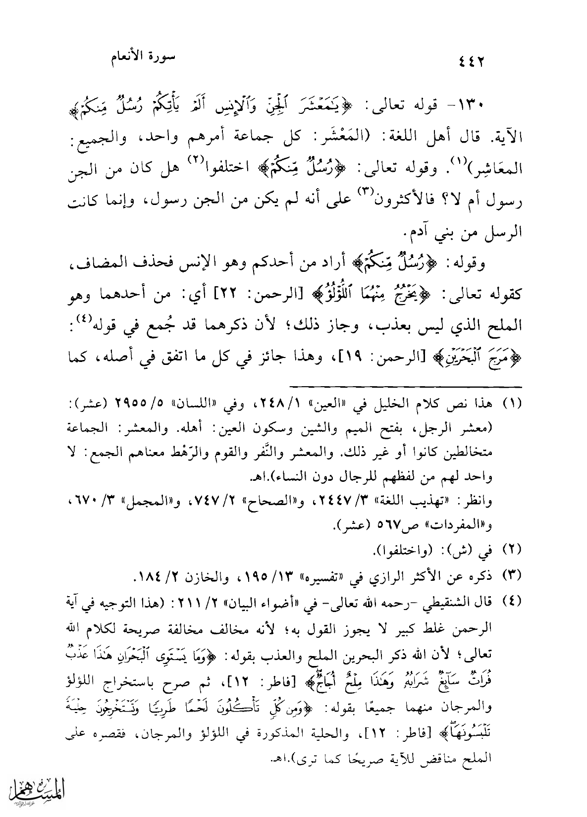 130 - قوله تعالى: {يَا مَعْشَرَ الْجِنِّ وَالْإِنْسِ أَلَمْ يَأْتِكُمْ رُسُلٌ مِنْكُمْ} الآية. قال أهل اللغة: (المَعْشَر: كل جماعة أمرهم واحد، والجميع: المعَاشِر) (¬1). وقوله تعالى: {رُسُلٌ مِنْكُمْ} اختلفوا (¬2) هل كان من الجن رسول أم لا؟ فالأكثرون (¬3) على أنه لم يكن من الجن رسول، وإنما كانت الرسل من بني آدم.