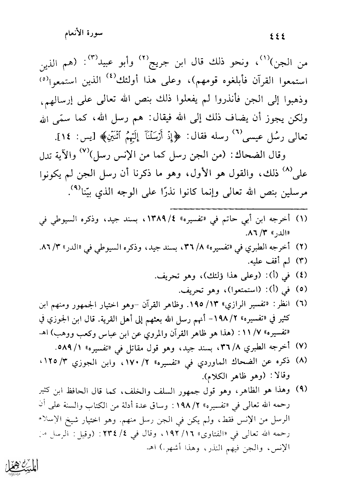 (¬9) وهذا هو الظاهر، وهو قول جمهور السلف والخلف، كما قال الحافظ ابن كثير رحمه الله تعالى في "تفسيره" 2/ 198: وساق عدة أدلة من الكتاب والسنة على أن الرسل من الإنس فقط، ولم يكن في الجن رسل منهم. وهو اختيار شيخ الإسلام في رحمه الله تعالى في "الفتاوى" 16/ 192، وقال في 4/ 234: (وقيل: الرسل من الإنس, والجن فيهم النذر، وهذا أشهر.) اهـ.