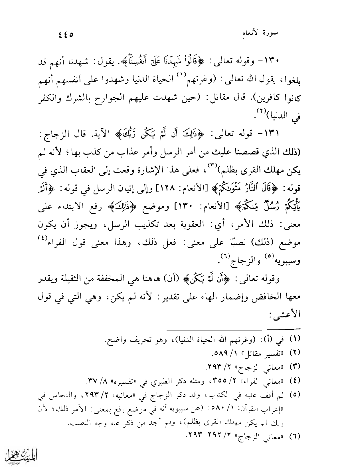 131 - قوله تعالى: {ذَلِكَ أَنْ لَمْ يَكُنْ رَبُّكَ} الآية. قال الزجاج: (ذلك الذي قصصنا عليك من أمر الرسل وأمر عذاب من كذب بها؛ لأنه لم يكن مهلك القرى بظلم) (¬3)، فعلى هذا الإشارة وقعت إلى العقاب الذي في قوله: {قَالَ النَّارُ مَثْوَاكُمْ} [الأنعام: 128] وإلى إتيان الرسل في قوله: {أَلَمْ يَأْتِكُمْ رُسُلٌ مِنْكُمْ} [الأنعام:130] وموضع {ذَلِكَ} رفع الابتداء على معنى: ذلك الأمر، أي: العقوبة بعد تكذيب الرسل، ويجوز أن يكون موضع (ذلك) نصبًا على معنى: فعل ذلك، وهذا معنى قول الفراء (¬4) وسيبويه (¬5) والزجاج (¬6).