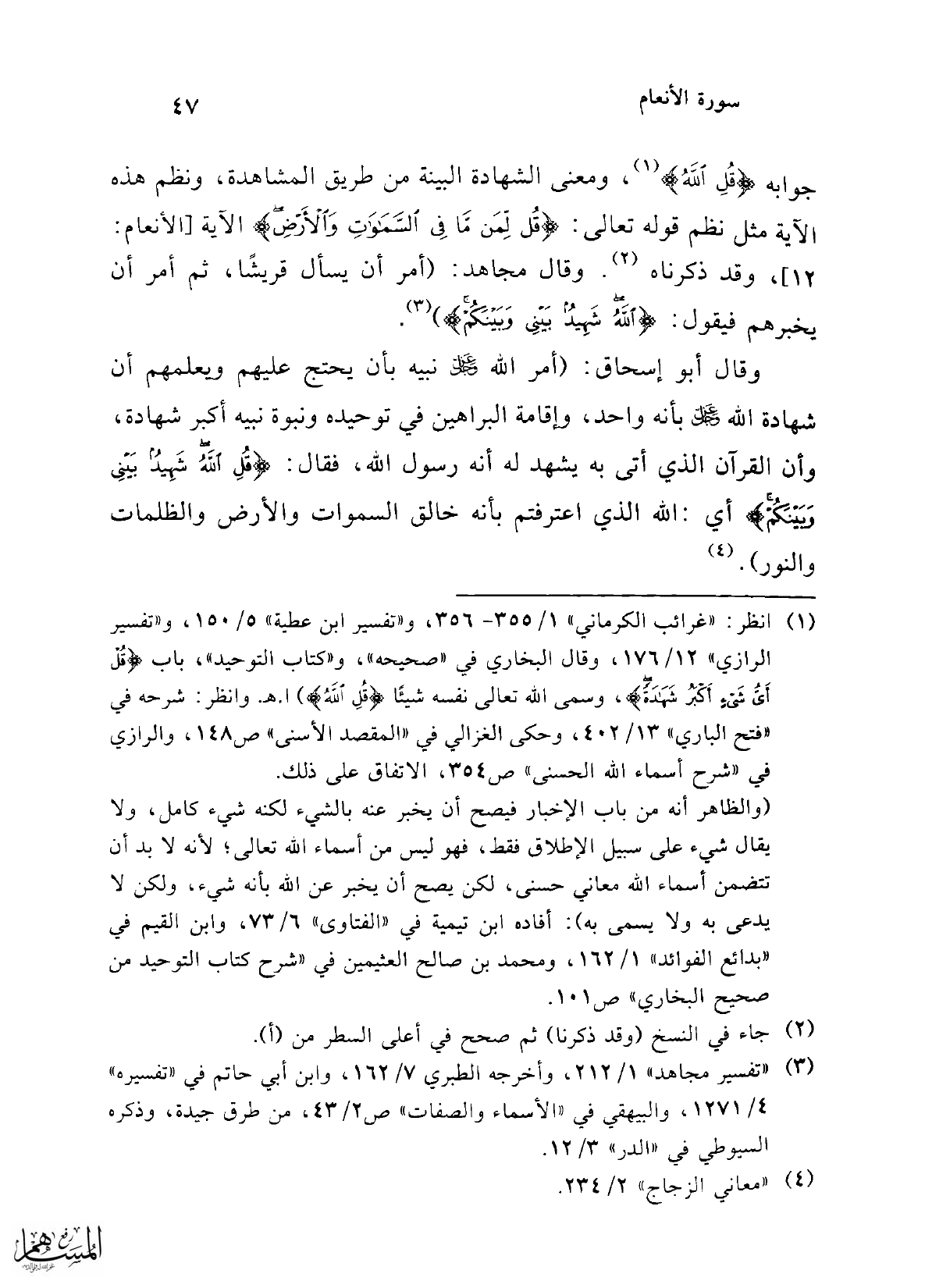 وقال أبو إسحاق: (أمر الله عز وجل نبيه بأن يحتج عليهم ويعلمهم أن شهادة الله عز وجل بأنه واحد، وإقامة البراهين في توحيده ونبوة نبيه أكبر شهادة، وأن القرآن الذي أتى به يشهد له أنه رسول الله، فقال: {قُلِ اللَّهُ شَهِيدٌ بَيْنِي وَبَيْنَكُمْ} أي: الله الذي اعترفتم بأنه خالق السموات والأرض والظلمات والنور). (¬4)