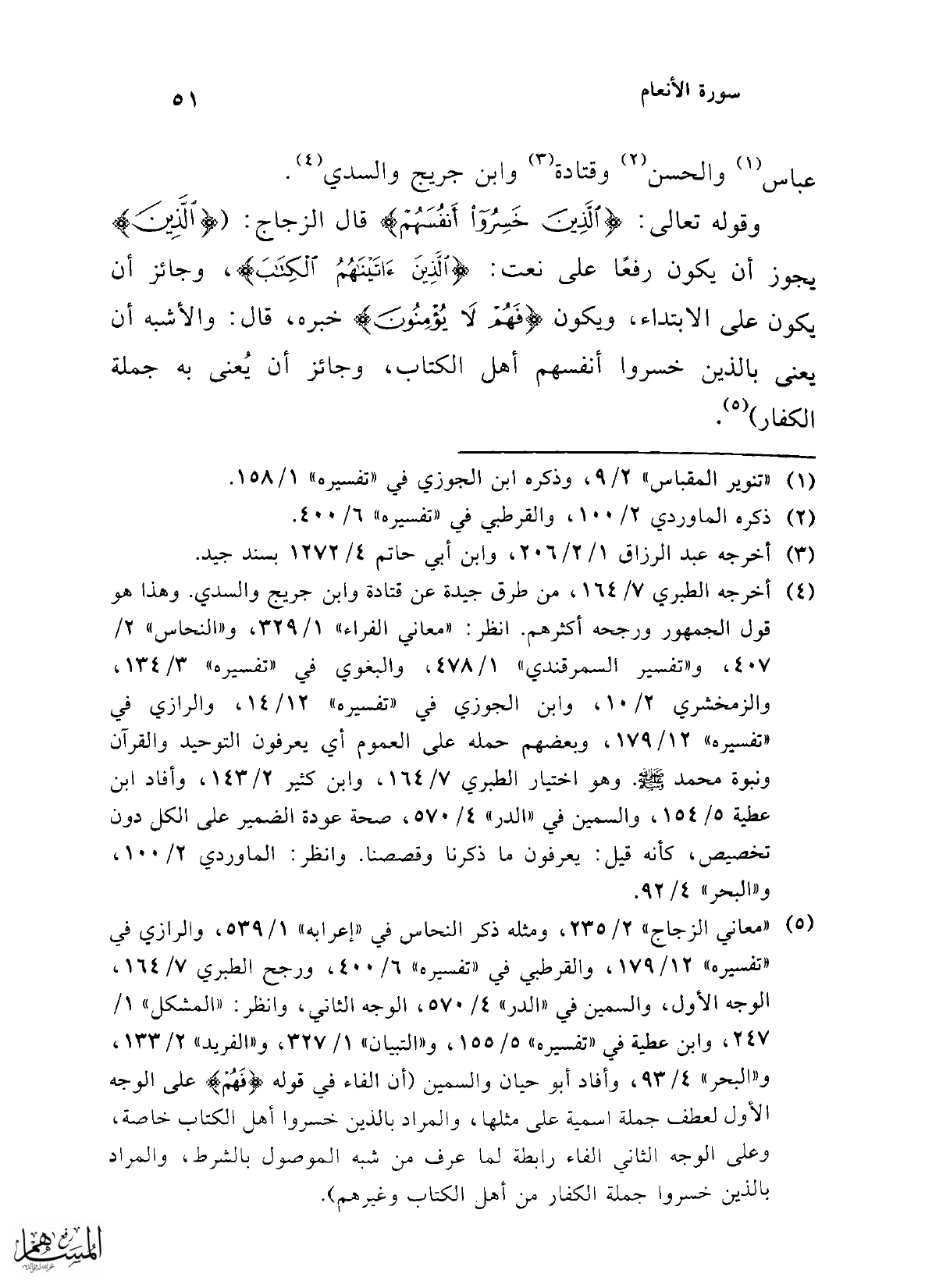 وقوله تعالى: {الَّذِينَ خَسِرُوا أَنْفُسَهُمْ} قال الزجاج: ({الَّذِينَ} يجوز أن يكون رفعًا على نعت: {الَّذِينَ آتَيْنَاهُمُ الْكِتَابَ}، وجائز أن يكون على الابتداء، ويكون {فَهُمْ لَا يُؤْمِنُونَ} خبره، قال: والأشبه أن يعني بالذين خسروا أنفسهم أهل الكتاب، وجائز أن يُعنى به جملة الكفار) (¬5).