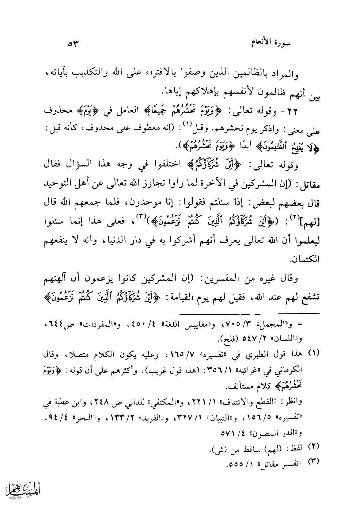(¬1) هذا قول الطبري في "تفسيره" 7/ 165، وعليه يكون الكلام متصلاً، وقال الكرماني في "غرائبه" 1/ 356: (هذا قول غريب)، وأكثرهم على أن قوله: {وَيَوْمَ نَحْشُرُهُمْ} كلام مستأنف.