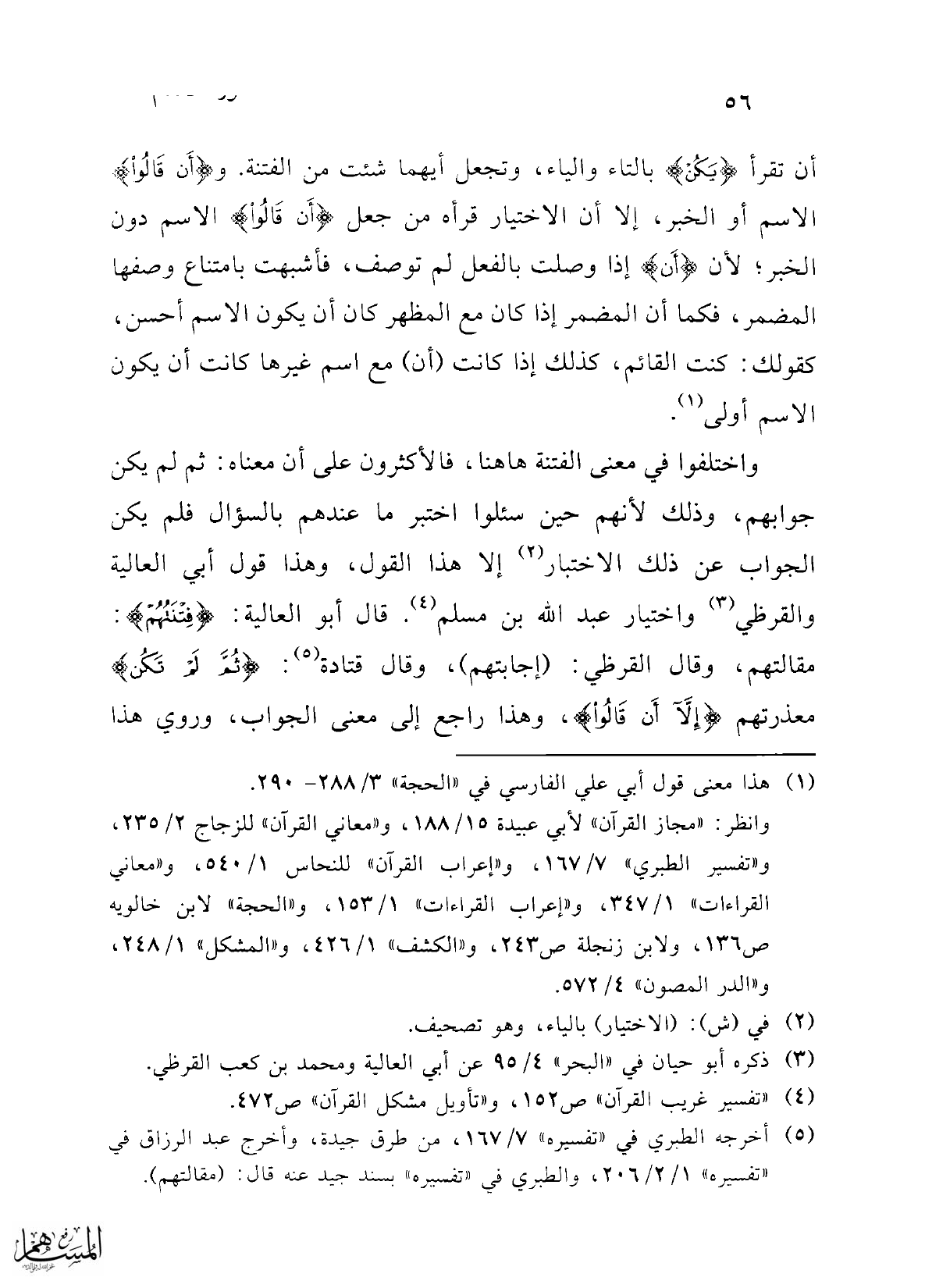 أن تقرأ {يَكُنْ} بالتاء والياء، وتجعل أيهما شئت من الفتنة. و {أَنْ قَالُوا} الاسم أو الخبر، إلا أن الاختيار قرأه من جعل {أَنْ قَالُوا} الاسم دون الخبر؛ لأن {أَنْ} إذا وصلت بالفعل لم توصف، فأشبهت بامتناع وصفها المضمر، فكما أن المضمر إذا كان مع المظهر كان أن يكون الاسم أحسن، كقولك: كنت القائم، كذلك إذا كانت (أن) مع اسم غيرها كانت أن يكون الاسم أولى (¬1).