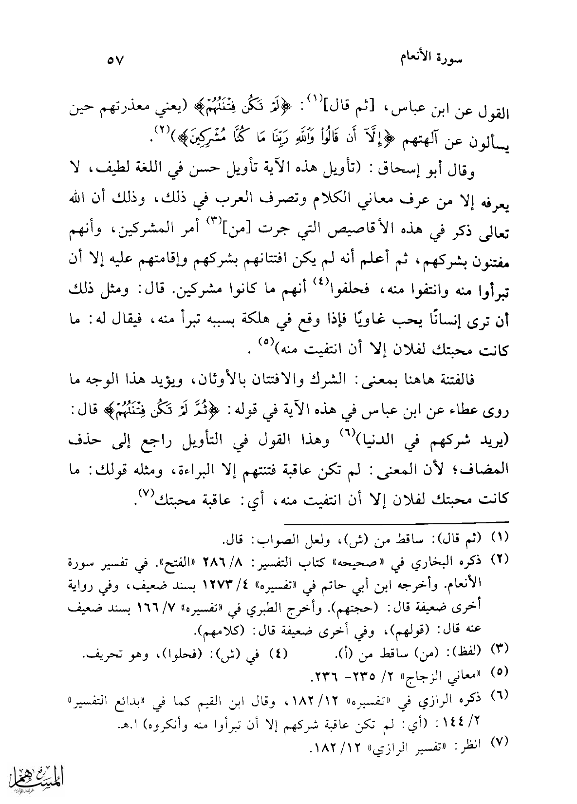(¬6) ذكره الرازي في "تفسيره" 12/ 182، وقال ابن القيم كما في "بدائع التفسير" 2/ 144: (أي: لم تكن عاقبة شركهم إلا أن تبرأوا منه وأنكروه) ا. هـ.